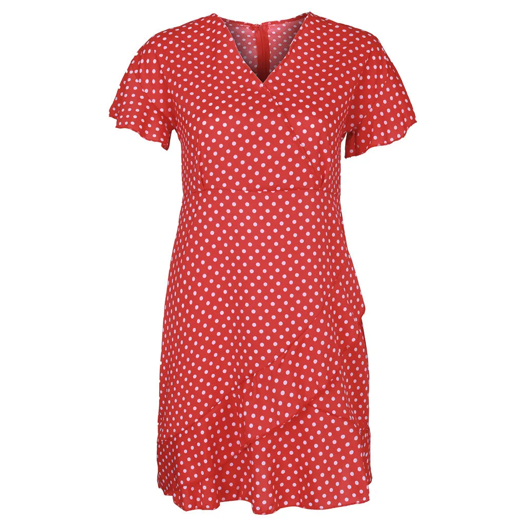 Женское мини-платье в горошек с v-образным вырезом и оборками на спине