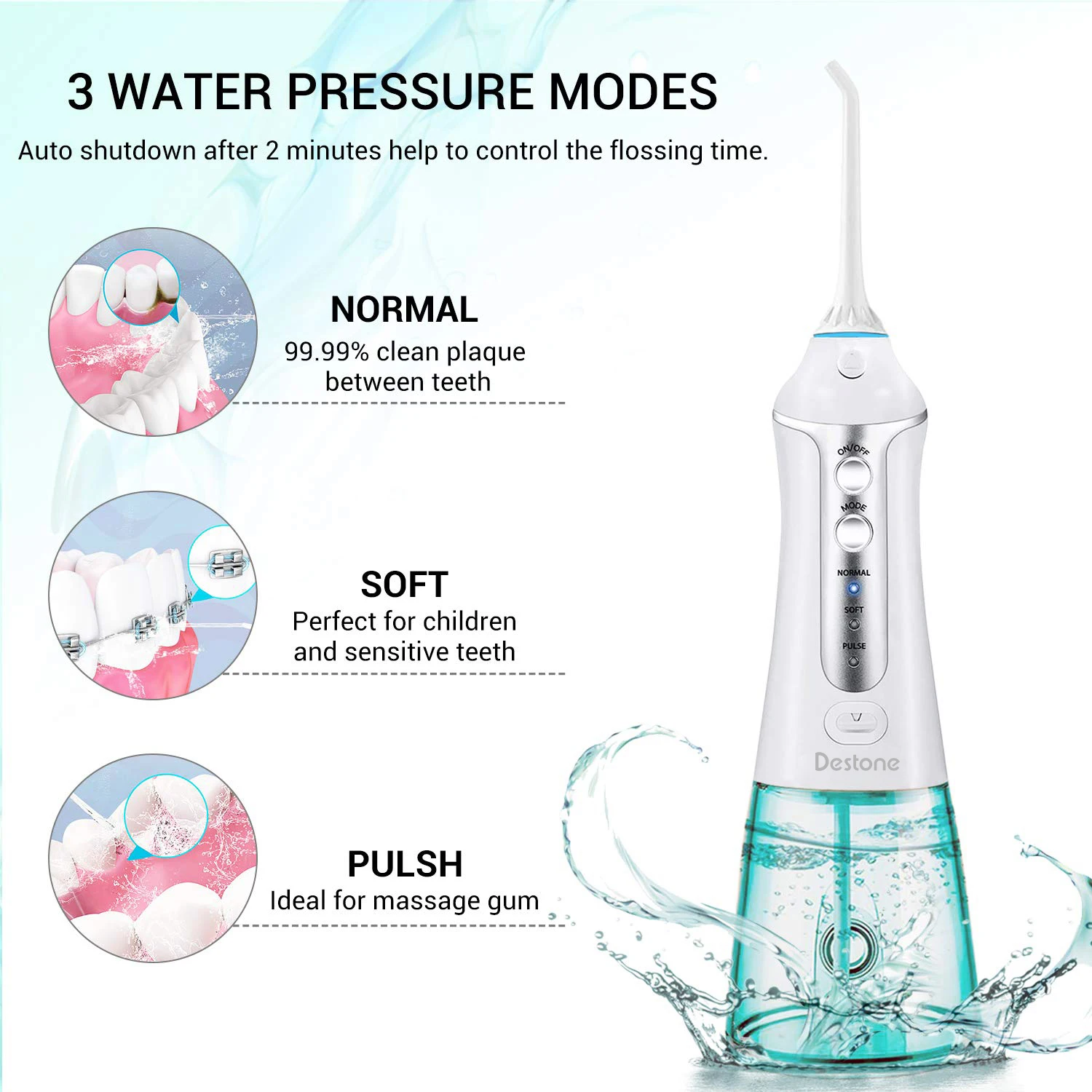 Эффективно удаляет 99% пищевой мусор и бактерии (включая вокруг брекетов, имплантатов и мочалок), массирует десны, повышает здоровье десен, обеспечивает гигиену полости рта, предотвращает неприятное дыхание.