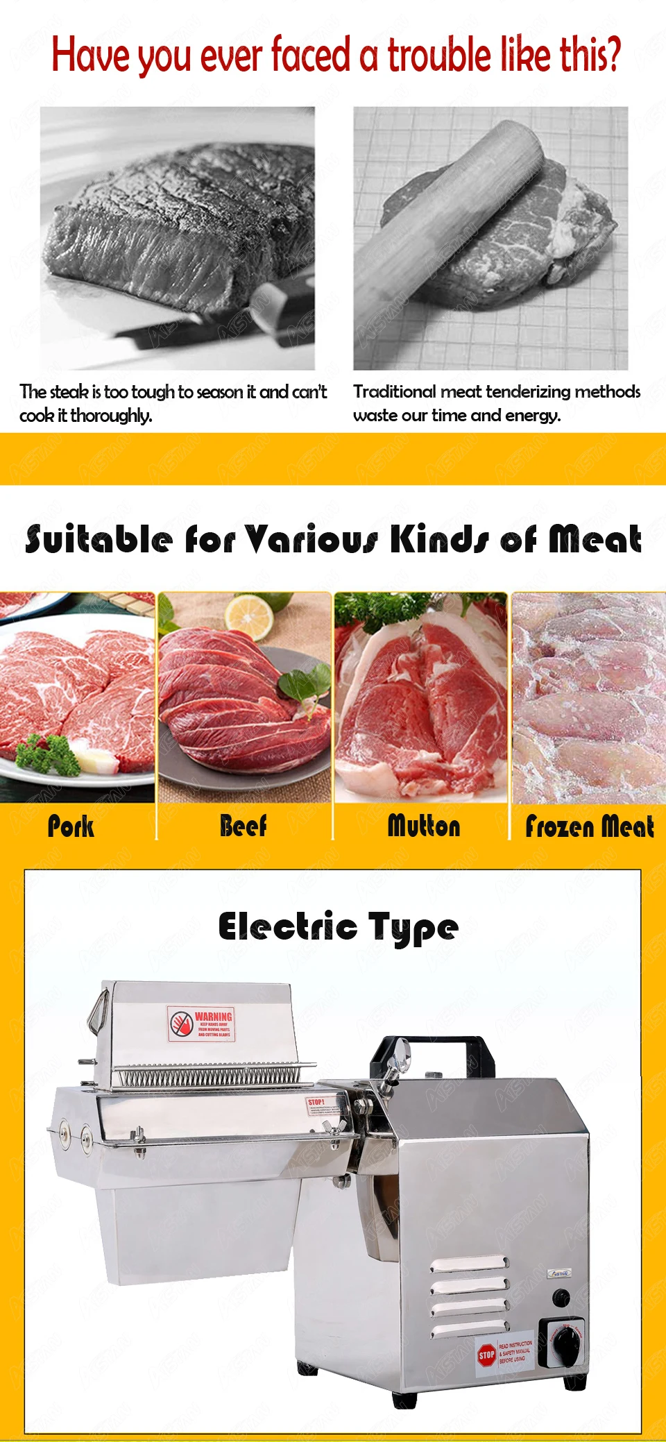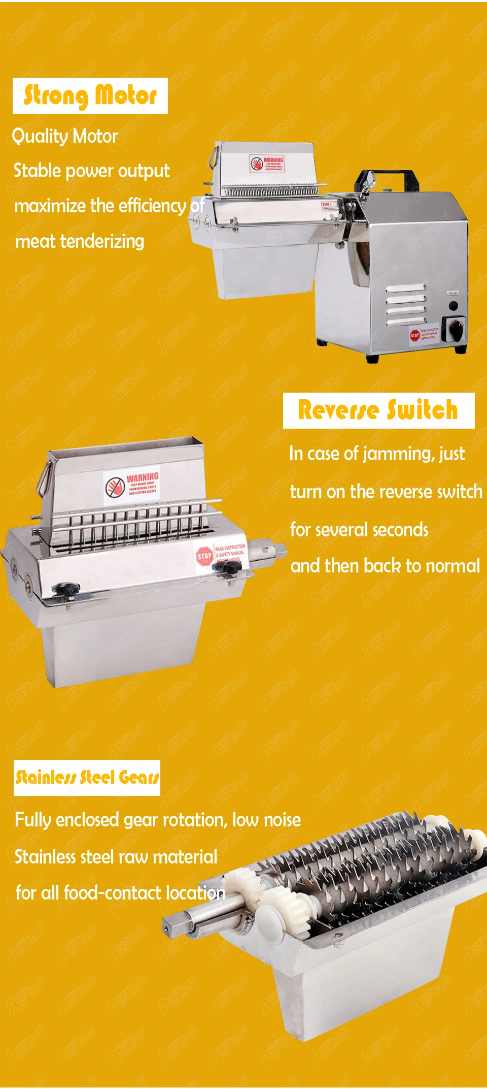 1. Подходит для различных видов мяса, таких как свинина, говядина, баранина и замороженное мясо, сохраняет свежий и оригинальный вкус. 2. Качественный материал, утолщенный материал из нержавеющей стали для всех мест контакта с едой, устойчивый к ржавчине после очистки. 3. Мощный двигатель 300 Вт, стабильная выходная мощность, Повышенная эффективность мясной тендерации. 4. Конструкция обратного переключателя, предвидение от перегрузки двигателя, защита от блокировки. 5. Шестерни из нержавеющей стали полностью закрыты при вращении, низком уровне шума.