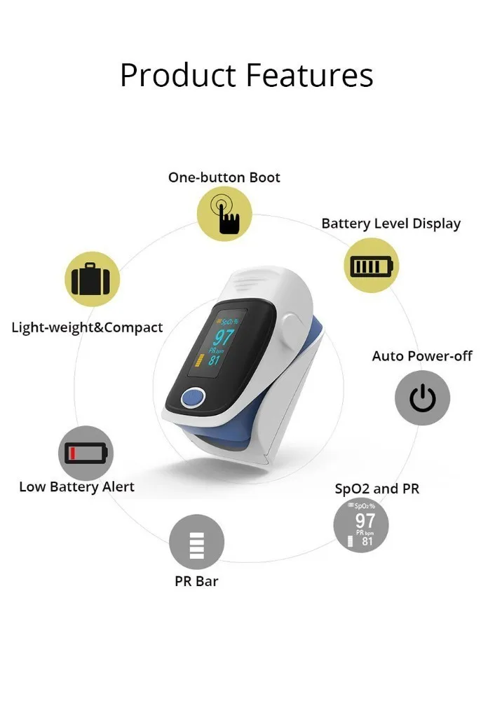 Напряжение батареи: 3 В постоянного тока (2 щелочных батареи типа AAA) Дистанция измерения: 5-15 см Интервал измерения: около 6 секунд Трехцветная подсветка: режим температуры поверхности:Зеленый Ниже 37,5 ℃ этоЗеленый От 37,6 °C до 38,0 °CЦвет: желтый 38,1 ℃ вышеКрасный Автоматическое выключение: ≦ 18 секунд Хранение: -20 ℃-45 ℃, относительная влажность: ≦ 85% И уровня кислорода в кровиОсобенности:---OLED дисплей:Двойной Цветной oled-дисплей. Лучше показывает данные.