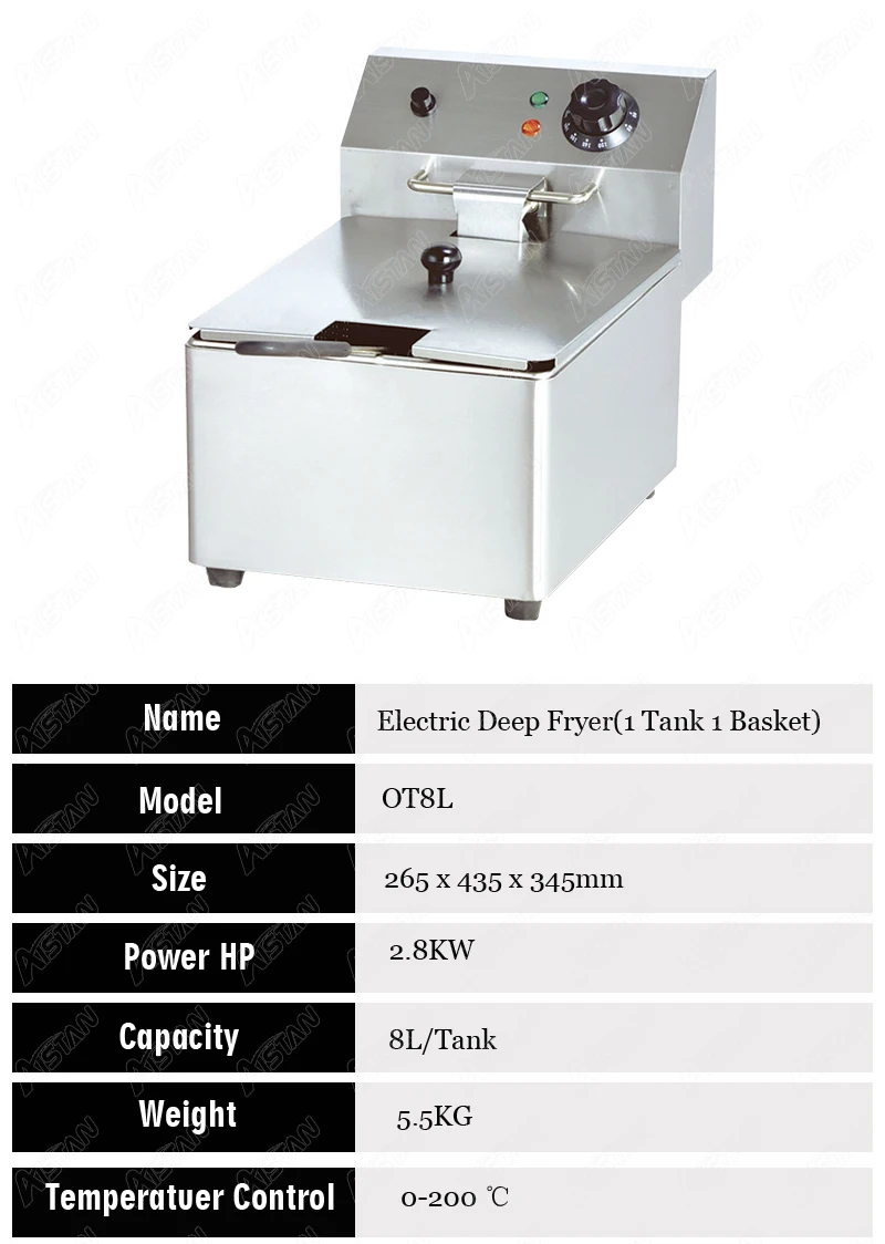 Электрическая Фритюрница 1 бак 1 корзина Размер: 265x435x345мм Мощность: 2,8 кВт Емкость: 8 л/бак Вес нетто: 5,5 кг Диапазон температур: 0-200 ℃