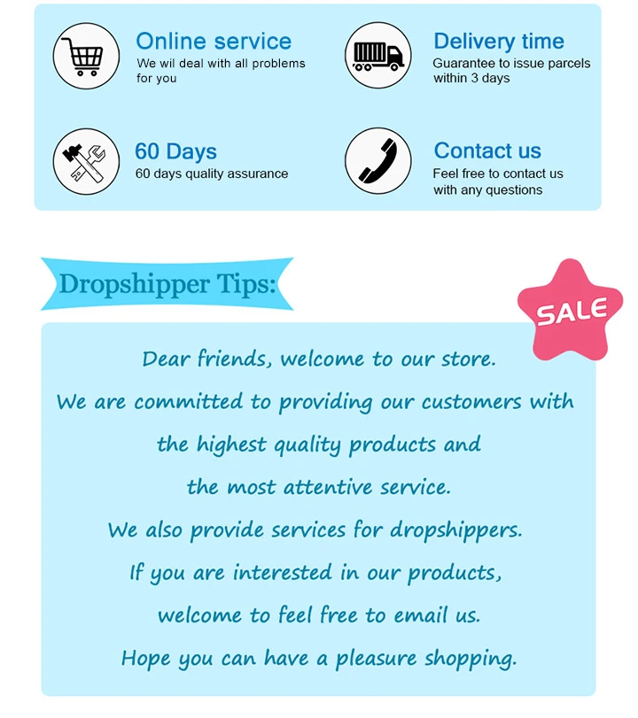 1. Если есть какие-либо проблемы с нашим продуктом, вы можете запросить возврат или возмещение в течение 7 дней после получения товаров. Но, пожалуйста, свяжитесь с нашей службой поддержки клиентов, прежде чем вернуть или открыть спор, мы постараемся сделать все возможное, чтобы решить проблему 2. Все товары должны быть возвращены в их первоначальном состоянии, иначе мы откажемся от возврата 3. Покупатель несет ответственность за все расходы, указанные в процессе возврата