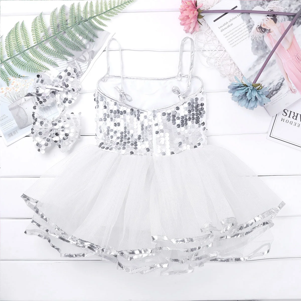 Поставляется с бантом, расшитым блестками, который нужно завязать на одном плече. 4 слоя платье, топ 3 сетчатых слоев с серебряной отделкой подола, 1 слоя подкладочной ткани. Подходящая заколка для волос.