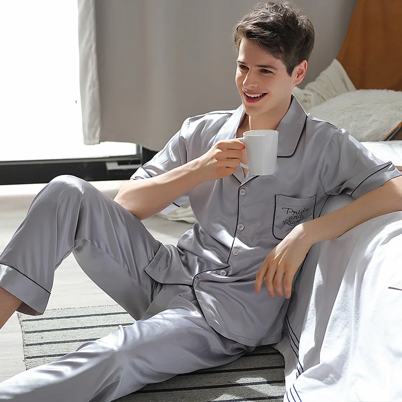 Брендовая шелковая пижама, мужская летняя ночная рубашка, пижама из искусственного шелка, пижамный комплект из 2 предметов, Мужская домашняя одежда, пижама с короткими рукавами