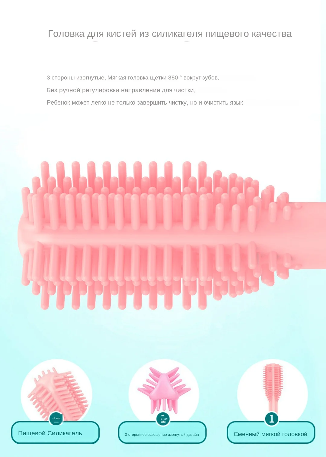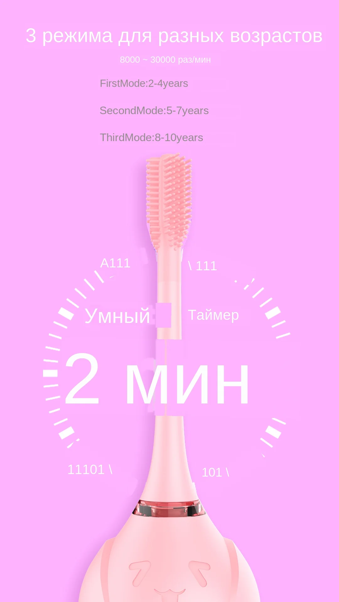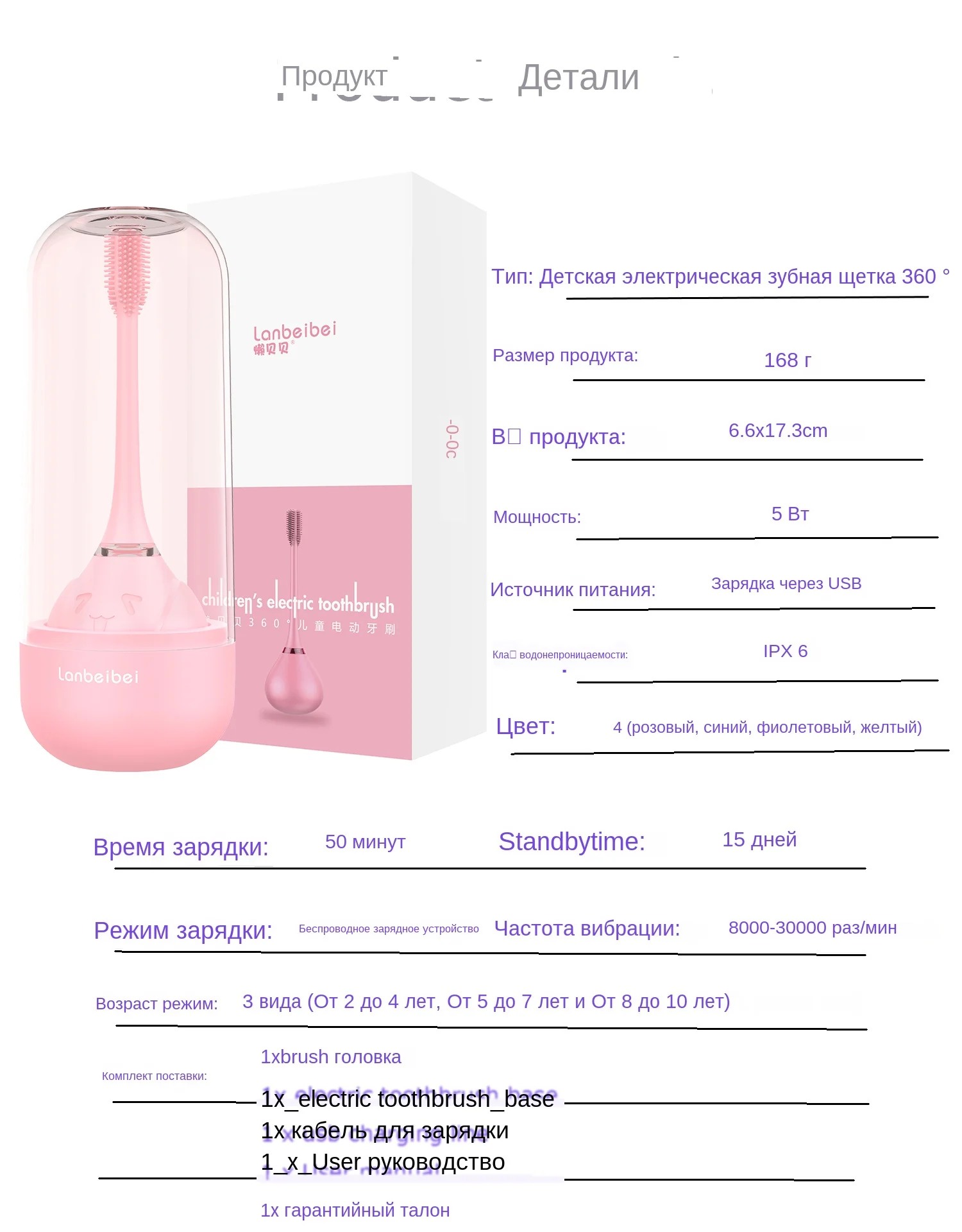 Разработан специально для От 2 до 10 лет детей Креативный дизайн: милая форма, вашему ребенку очень понравится Головка кисти: пищевой силикагель, 3 стороны изогнутый дизайн, сменный Самая безопасная зарядка: самый продвинутый режим зарядки ---- резонансная Беспроводная зарядка, нет открытого металлического листа Умный Таймер: 2-mins умный таймер чистки. Помогите Вашему ребенку развить правильную привычку чистить зубы 3 возрастных режима: 8000-30000times/min Первый режим: 2- 4 года Второй режим: 5-7 лет Третий режим: 8-10 лет Время работы в режиме ожидания: 15 дней после 50 минут полной зарядки