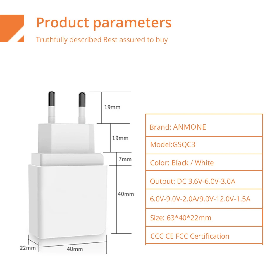 Примечание: Эта функция быстрой зарядки зарядного устройства относится только к процессорам телефонов серии Qualcomm. Как 625/801/821 и т. Д.). Бренд, который мы описали, может включать эти процессоры, но не представляет все модели, которые он поддерживает. Если вы не уверены, поддерживает ли ваш телефон, пожалуйста, свяжитесь с нами. Устройства Apple не поддерживают быструю зарядку Qualcomm, но принимают стандартную usb-зарядку 1A. Совместим с быстрой зарядкой Huawei FCP Высокая эффективность Новейшая и самая быстрая в мире технология зарядки, в 4 раза быстрее, чем традиционное зарядное устройство, в 2 раза быстрее, чем быстрое зарядное устройство 1,0, в 1,4 раза быстрее, чем быстрое зарядное устройство 2,0 Мульти-защита, надежное качество 5 видов защиты для безопасности вашего устройства: огнеупорные материалы, защита от перенапряжения, защита от перегрузки по току, защита от перегрева, защита от короткого замыкания Часто задаваемые вопросы: В1: Могу ли я использовать Fonken QC3.0 для зарядки устройств, которые не имеют Quick charge 3,0 Tecknology? A1: Да. Вы можете. Технология Quick charge 3,0 поддерживает выходное напряжение без звука. Вопрос 2: Как я могу узнать, поддерживает ли мое устройство технологию Qualcomm Quick charge 3,0 или нет? A2: пожалуйста, обратитесь к руководству пользователя вашего устройства или свяжитесь с производителем для определения информации. Любые устройства с технологией Qualcomm QC1.0/2,0/3,0 могут быть поддерживаются настенным зарядным устройством Fonken QC3.0. Материал: огнеупорный материал из поликарбоната Вход: 100-240 В переменного тока 50/60 Гц Выход: DC5-9V/2А. 9 V-12 V/1.5A Вес: 42 г/1,4 унции Размеры: 80X38.6X22. 2 мм/3.15X1.5X0. 8 дюймов О кабеле Предназначен для быстрой зарядки 2128AWG Нейлоновый плетеный кабель длиной 1 метр 1 x быстрое зарядное устройство 1 х USB кабель зарядного устройства (опционально)
