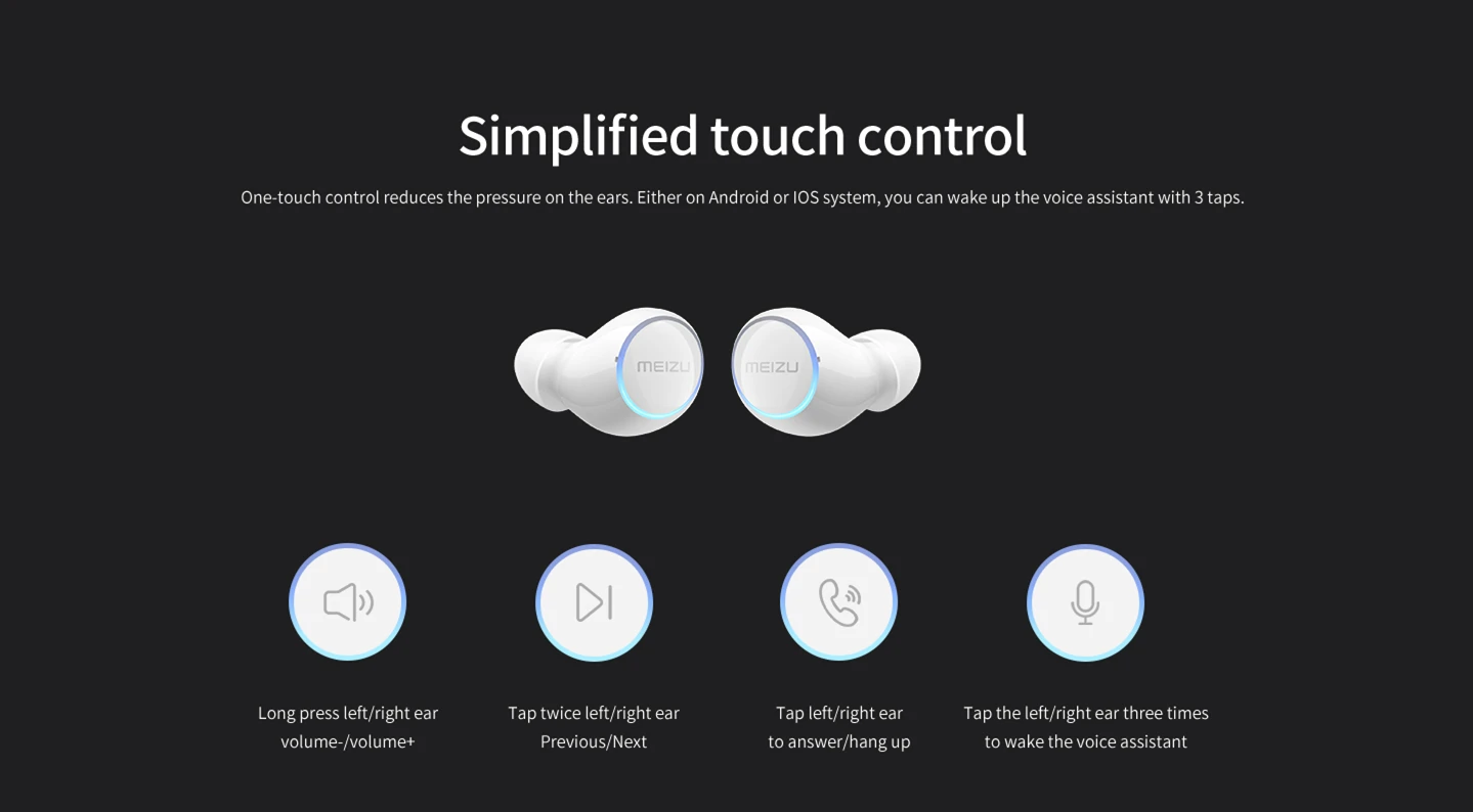 Управление одним касанием снижает давление на уши. Вы можете просыпаться в системе Android или IOS Голосовой помощник с 3 нажатиями.