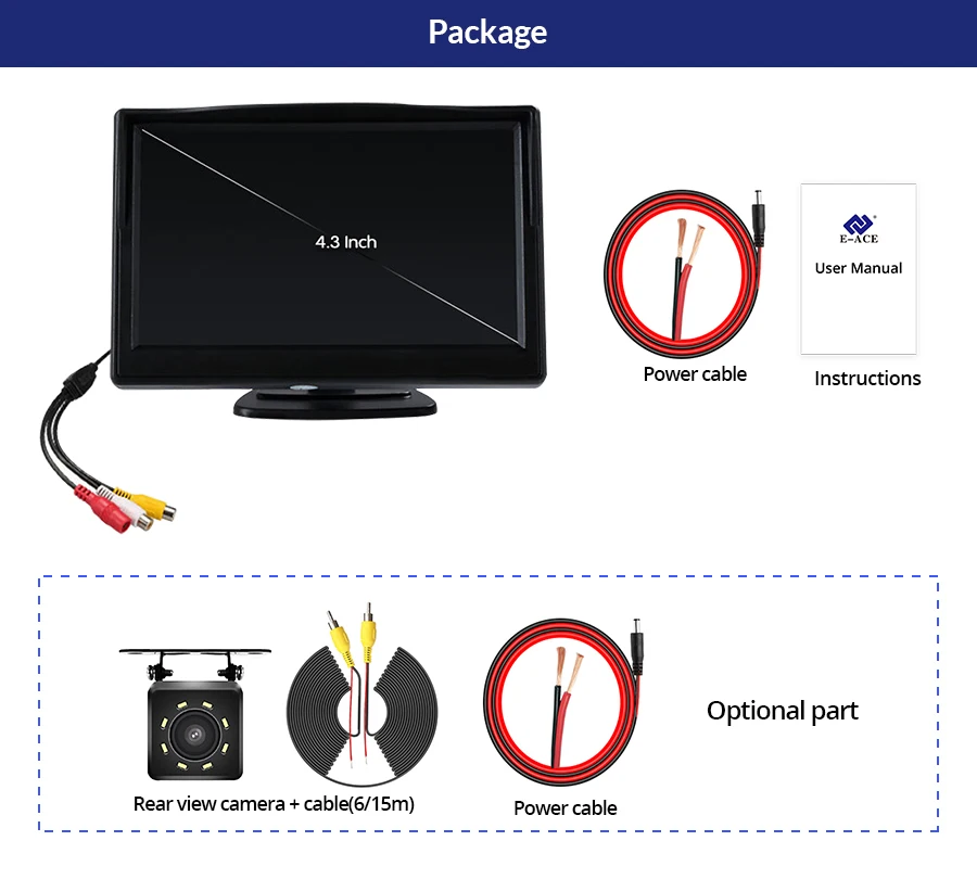 Описание и характеристики: ● Водонепроницаемый дизайн ● Включает в себя 8 светодиодный фонарь и поддерживает ночное видение в пределах 6 метров монитор заднего вида ● Поддержка видеосистем NTSC ● Высокое разрешение и широкий угол обзора ● Подходит для различных транспортных средств ● Размер дисплея: 4:3 ● Разрешение: 480x272 ● Цветовая модель: RGB ● Видеосистема: PAL/NTSC ● Источник питания: 12 В постоянного тока ● Потребляемая Мощность n: 2 Вт
