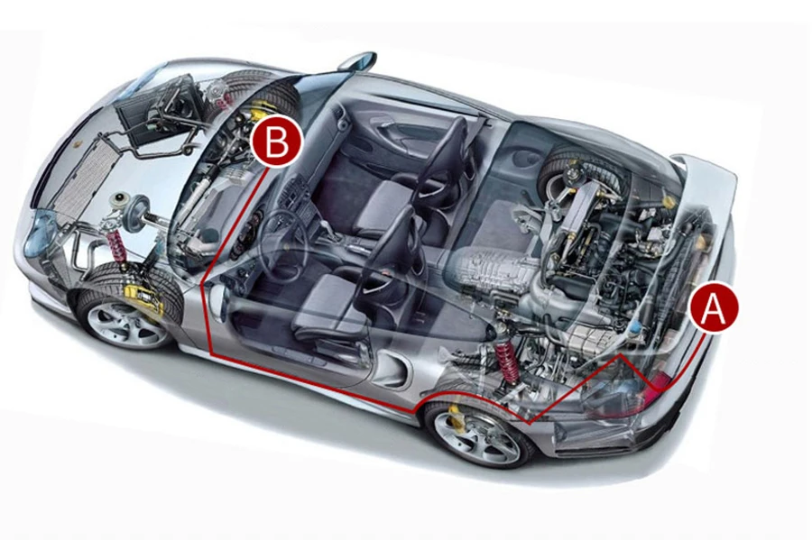 A-это задняя камера, блок питания подключен к положительным и отрицательным полюсам лампы заднего хода, красный-это положительный полюс, черный-отрицательный полюс, B-дисплей, красный соединен с положительным полюсом ACC, И Черный подключен к отрицательному полюсу АКК.