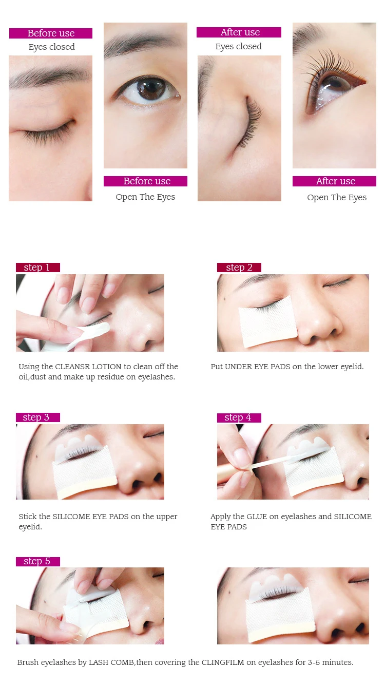 Шаг 1. Очищающий Лосьон удаляет масло, пыль и макияж на ресницах. Шаг 2. Нанесите накладки под глаза на нижние веки. Шаг 3 приклейте силиконовые накладки на верхние веки. Шаг 4 нанесите гулу на ресницы и силиконовые подушечки для глаз. Шаг 5 кисть для ресниц по форме Y кисть Шаг 6 нанесите на ресницы лосьоны Perm, закрыв пленку на ресницы в течение (10) минут. Шаг 7 нанесите лосьоны для фиксации на ресницы, закрыв пленку на ресницы в течение (10) минут. Шаг 8 удалите пленку, используя очищающий лосьон, чтобы очистить все остатки Перми. Шаг 9, наконец, нанесите питательные лосьоны для восстановления ресниц.