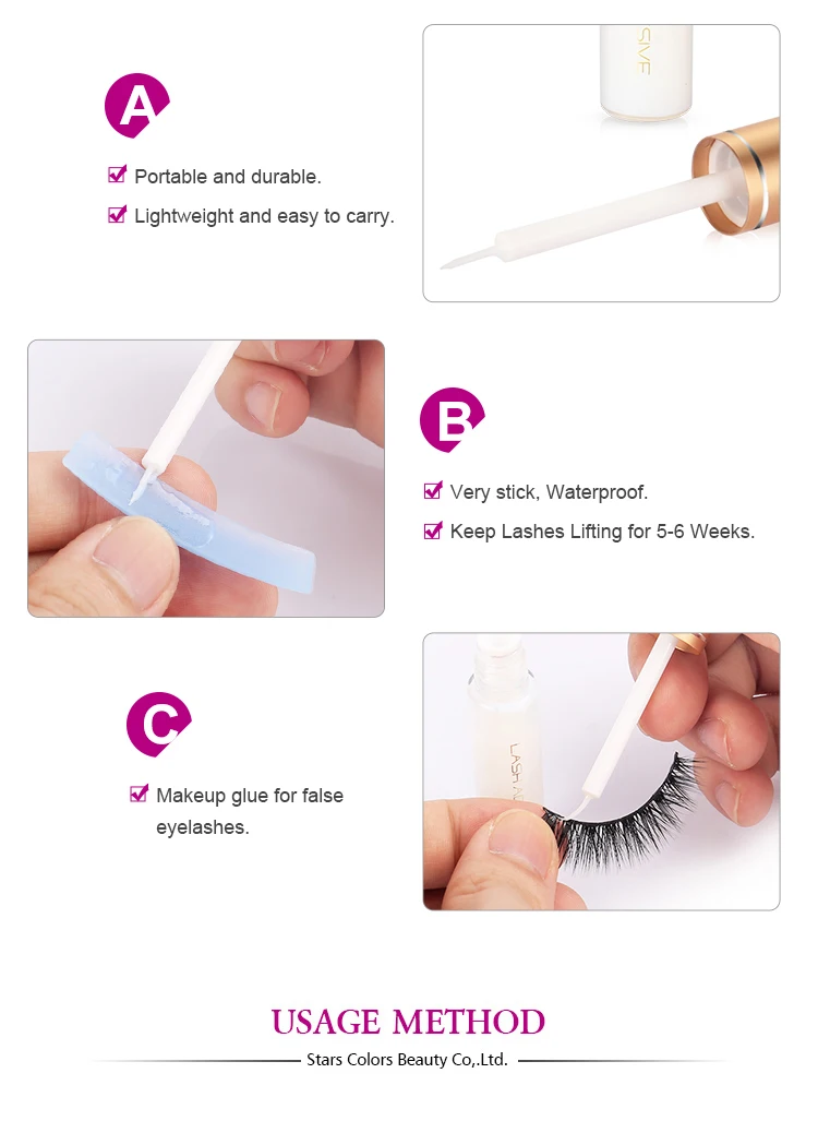 1. Портативный и прочный, легкий, легко носить с собой 2. Сильный Клей для подъема ресниц 3. Обеспечивает дополнительную липкость без абсолютного никакого вреда для кожи 4. Имеет преимущество водонепроницаемости, клей не отпадает легко