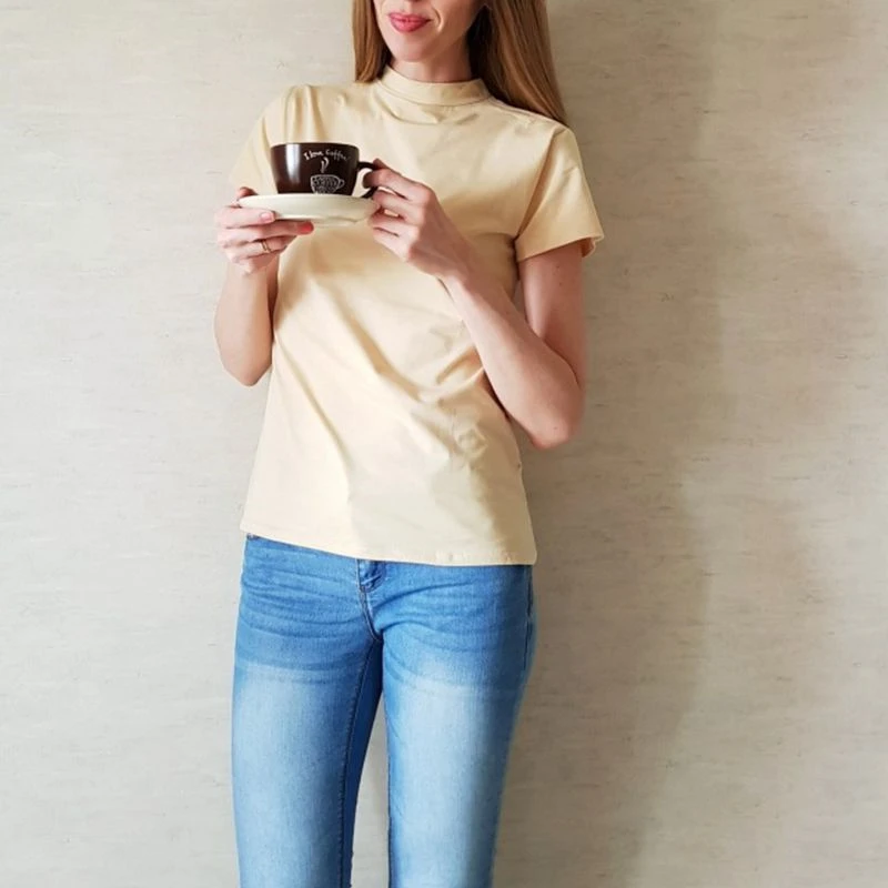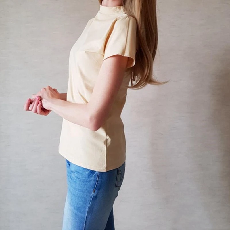 Материалы:95% хлопок, 5% спандекс Цвет:Черный, белый, синий, желтый, серый, абрикосовый, коричневый, красный вариант Размер:S,M,L,XL,2XL, размера плюс Стиль:Облегающий крой, полувысокий ворот, водолазка, круглый вырез, круглый вырез, летняя классная одежда Сезон:Летняя Женская Базовая футболкаS: обхват груди 78-82 см, длина 55 см