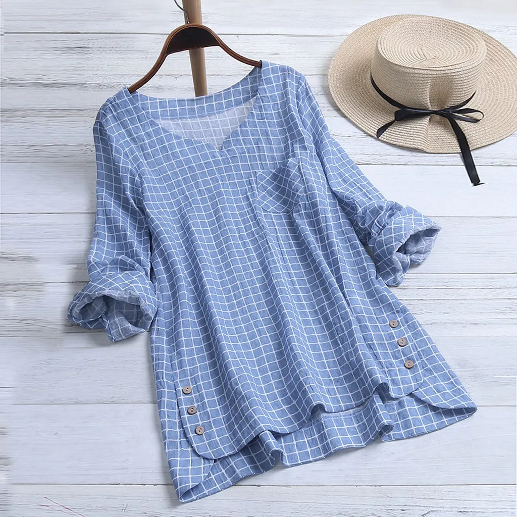 Женская Повседневная хлопковая Футболка большого размера, винтажная клетчатая Свободная блузка на пуговицах