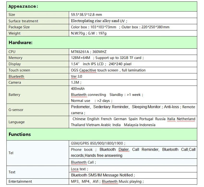 Описание: Состояние: Новые смарт-часы Q18 Bluetooth с поддержкой sim-карты для Android IOS 1. Поддержка sim-карты, позволяет совершать и принимать телефонные звонки непосредственно на запястье 2. Также Синхронизируйте звонки и уведомления приложений с парного мобильного телефона 3. Мини Персональный менеджер по здоровью отслеживает вашу повседневную деятельность, Записывает ваш сон и напоминает вам о долгом сидении 4. Встроенная камера 1.3MP, также поддерживает дистанционное управление затвором над камерой мобильного телефона 5. Двусторонняя функция защиты от потери оповещает вас, когда телефон и часы находятся на определенном расстоянии от каждого Другие 6. Поддержка подключения Bluetooth 7. Настраиваемые темы пользовательского интерфейса для большего удовольствия 8. Ультразвуковая звуковая полость с закрытой алюминиевой пленкой для звуков высокого качества 9. Тонкий, современный дизайн дополняет Ваш повседневный образ 10. Прямоугольный чехол из нержавеющей стали с матовой отделкой 11. 1,54 ''изогнутый, Высокочувствительный емкостный экран 12. Эргономичный ремешок для часов из ТПУ с тусклым лаком, удобно носить 13. Полимерный аккумулятор емкостью 500 мА · ч более 7 дней в супер длительном режиме ожидания 14. Пожалуйста, обратите внимание, что уведомление приложения доступно только на Android 4,2 или выше и не поддерживается ed на iOSSpecifications: 1. Технология обработки поверхности: проволока из нержавеющей стали для рисования основных цветов 2. ЦП: MTK 3. Емкость: 128 м + 64 м; Поддержка 32 ГБ макс. Карта памяти TF 4. LCD: 1,54 'дюймовый TFT LCD высокой четкости 5. Разрешение: 240x240 пикселей 6. Частота: 360 МГц 7. Экран: IPS емкостный сенсорный экран 8. Blutooth: Ver 3,0 9. Камера: 1,3 м 10. Аккумулятор: 500 мА · ч полимерный аккумулятор. 11. Подключение по Bluetooth в режиме ожидания: >1 неделя; Нормальное использование: > 3 дня 12. G-сенсор: Поддержка шагомера, напоминания о сидячем положении, мониторинг сна; Защита от потери; Удаленное фотографирование 13. Материал: посылка из сплава включает в себя: 1 умные часы 1 кабель USB 1 Руководство пользователя