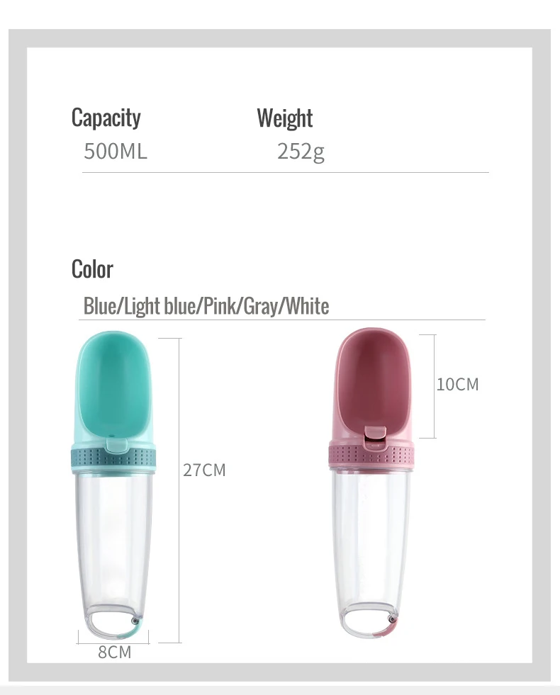 Название продукта: домашние животные из стакана для воды (Защита окружающей среды) Емкость стакана воды: 500 мл Цвет: серый, синий, розовый, белый, светло-голубой Термостойкий АБС-пластик соответствует FDA, чтобы убедиться, что ПЭТ-бутылка для воды безопасна и нетоксична, Бутылка для воды Doggy с одним замком для воды и уплотнительным резиновым кольцом, чтобы избежать протечек, Одна кнопка разблокировки с одной рукой; нажмите кнопку воды после разблокировки и вода заполнит желоб. Бутылка для путешествий для домашних животных-отличный выбор для путешествий или активного отдыха Модный внешний вид, широкая раковина позволяет вашей собаке легко пить воду.