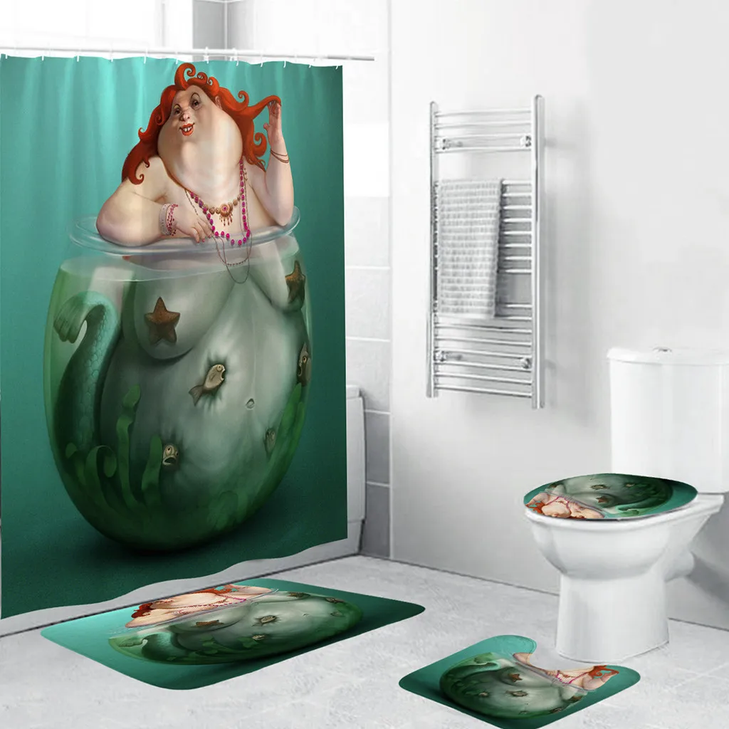 4PCS Non Slip Toilet Polyester Cover Mat Set Bathroom Shower Curtain