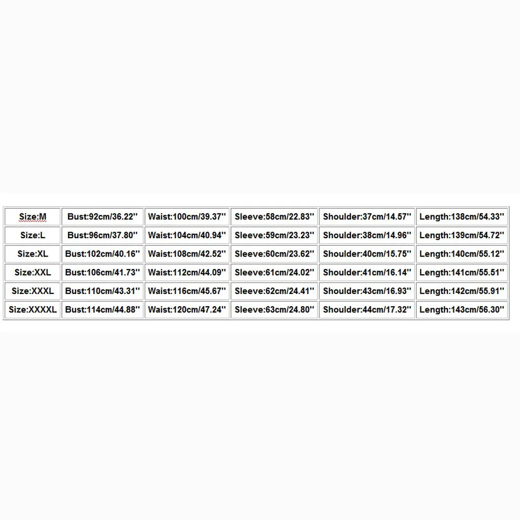 Size Bust Waist Sleeve Shoulder Length M 92cm/36.22'' 100cm/39.37'' 58cm/22.83'' 37cm/14.57'' 138cm/54.33'' L 96cm/37.80'' 104cm/40.94'' 59cm/23.23'' 38cm/14.96'' 139cm/54.72'' XL 102cm/40.16'' 108cm/42.52'' 60cm/23.62'' 40cm/15.75'' 140cm/55.12'' XXL 106cm/41.73'' 112cm/44.09'' 61cm/24.02'' 41cm/16.14'' 141cm/55.51'' XXXL 110cm/43.31'' 116cm/45.67'' 62cm/24.41'' 43cm/16.93'' 142cm/55.91'' XXXXL 114cm/44.88'' 120cm/47.24'' 63cm/24.80'' 44cm/17.32'' 143cm/56.30''