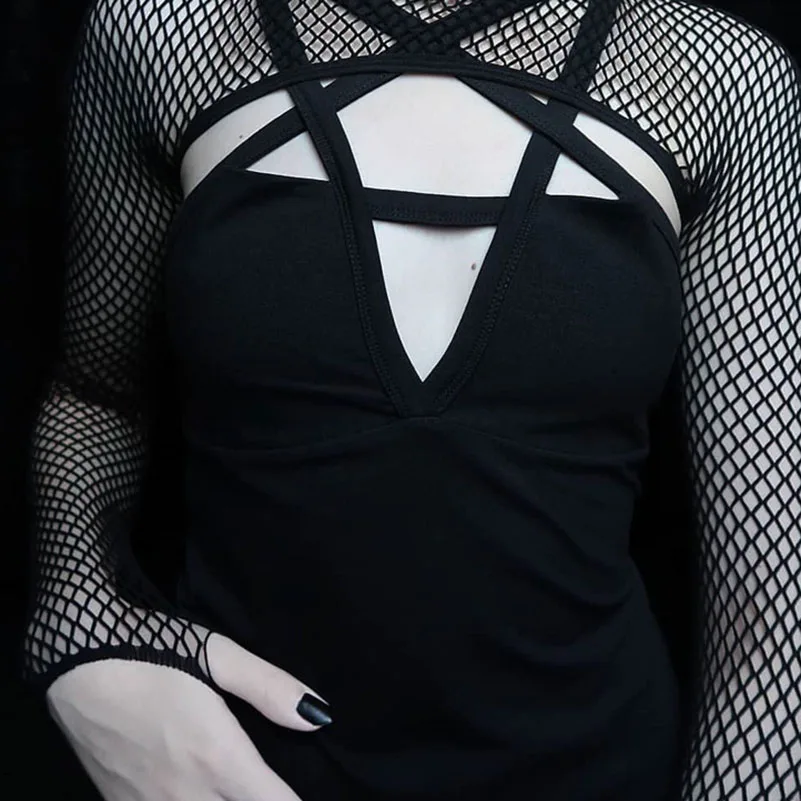 Женский комбинезон с открытой спиной и перекрестным ремешком спереди, черный облегающий комбинезон с пентаграммой без рукавов, новинка 2019