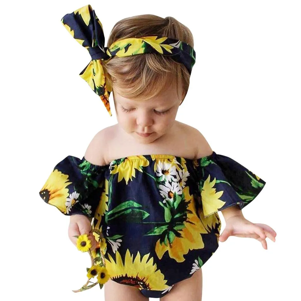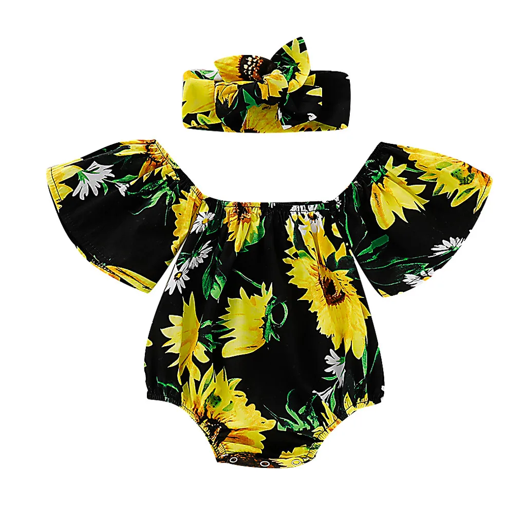Детские топы с открытыми плечами и оборками для маленьких девочек; комбинезон с цветочным принтом и лентой для волос; боди