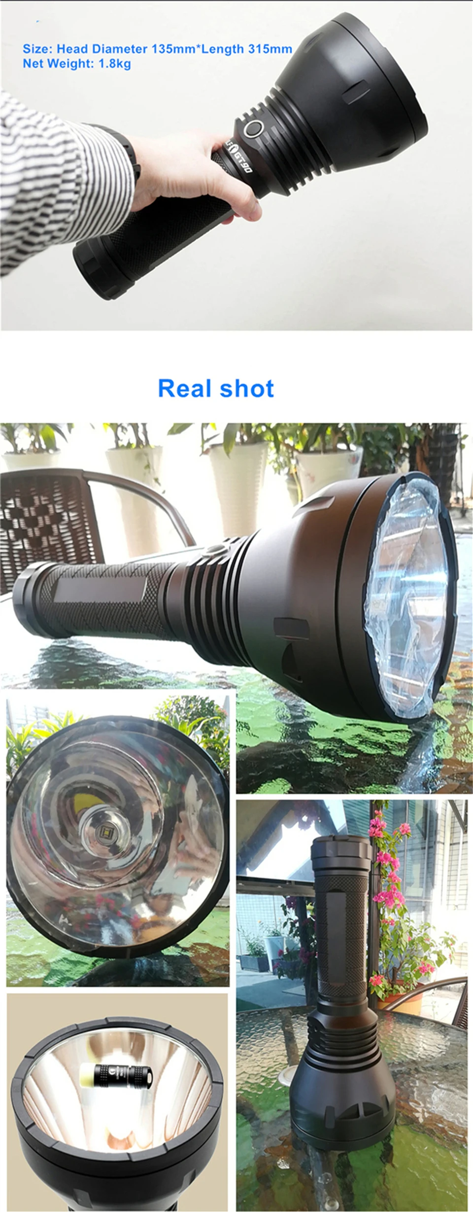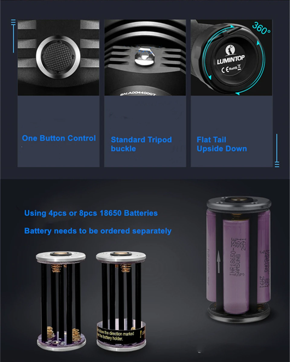 Lumintop BLF GT90 Технические характеристики: 1. SBT-90 Luminus и прошивка NarsilM V1.3 2. Люмен: 7000Lm +, интенсивность: 1850kcd +, дальность луча 2720 метров + 3. Батарея: Используйте 8 или 4 незащищенных аккумулятора 18650, батареи должны быть приобретены отдельно 4. Режим работы по умолчанию является плавным затемнением, и его также можно установить в режим пониженного затемнения. Когда GT90 включен, он запоминает яркость перед выключением (с памятью), а двойной щелчок-turbo 5. Кроме того, есть лунные шестерни, стробоскопы и т. д., и тактический (мгновенный) режим. Для конкретных операций, пожалуйста, обратитесь к руководству. 6. Есть заводской Сброс: три нажатия кнопки (введите отображение состояния батареи), еще раз нажмите (введите версию прошивки), на этот раз нажмите и удерживайте кнопку в течение 2 секунд, когда дисплей мигает 4 раза, это означает успех