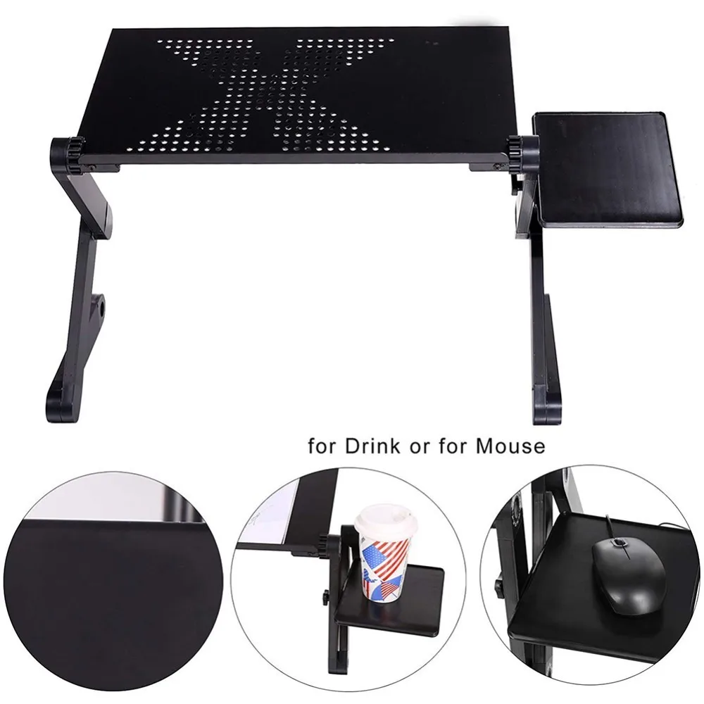 Это портативный и Универсальный складной компьютерный стол, который можно разместить на столе, чтобы быть стоящим столом, или на кровати или в любом месте, где вы хотите удобно использовать свой ноутбук! Вы также можете положить книги или планшеты, чтобы освободить руки. Складные ножки стола можно поворачивать на 360 градусов. Зафиксируйте положение под разными углами. Нажмите кнопку регулировки для регулировки угла. Ручка имеет шкалу для подтверждения угла и регулировки баланса таблицы. Ножки изготовлены из алюминиевого сплава, который является прочным и гибким. Под столом есть вентилятор, который может помочь вашему электронному оборудованию рассеивать тепло и улучшить его срок службы.