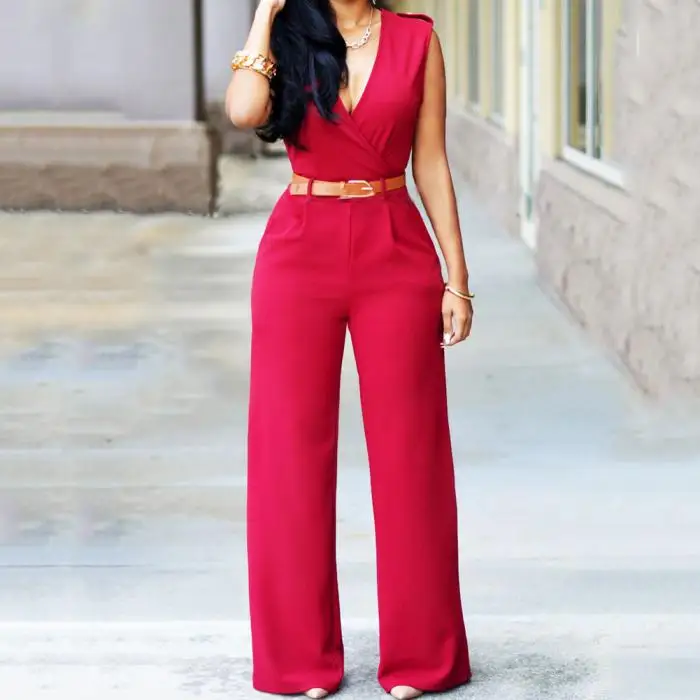 Популярный модный летний женский комбинезон с поясом, сексуальный однотонный комбинезон с v-образным вырезом без рукавов с высокой талией и широкими штанинами, женские комбинезоны 19ING