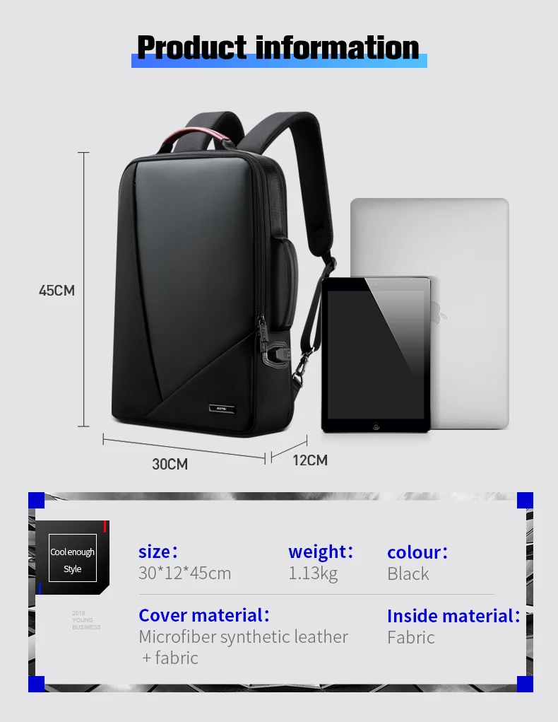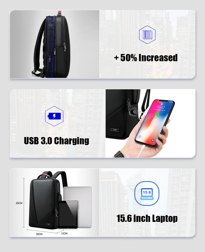 ♦50% Увеличенная емкость ♦15,6 дюймов рюкзак для ноутбука ♦3,0 USB зарядка (3 в 1 кабель в подарок) ♦3D стерео вентиляция на задней панели ♦Водоотталкивающий и противокражный карман ♦Внутренняя цепочка для ключей и ручка для багажа ♦Удобный слот для карт на плечевом ремне ♦Лучший подарок для ваших друзей или семьи