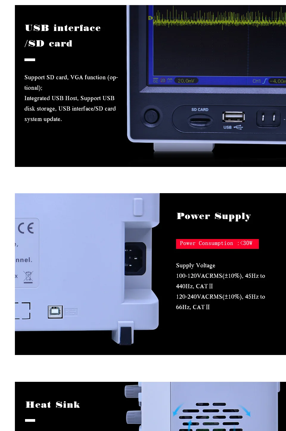 2 канальный цифровой осциллограф. Генератор произвольных и функциональных сигналов, 1 канал. Ключи для osilloscope и генератора сигналов разделены, что обеспечивает удобство работы одновременно. Осциллограф: 200/100/70 МГц полоса пропускания, 1GSa/s частота дискретизации. Генератор произвольных волновых сигналов 25 МГц, разрешение 12 бит, DDS 200 МГц, цветной ЖК-дисплей 7 дюймов 64K, разрешение 800x480.