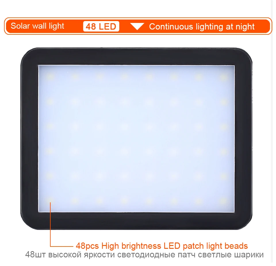 1,48 светодиодов супер яркий: Эта новейшая версия солнечного внешнего света встроена-48 белых светодиодов, ярче и шире, чем раньше, диапазон освещения 60 квадратных метров и яркость до 800 люмен.