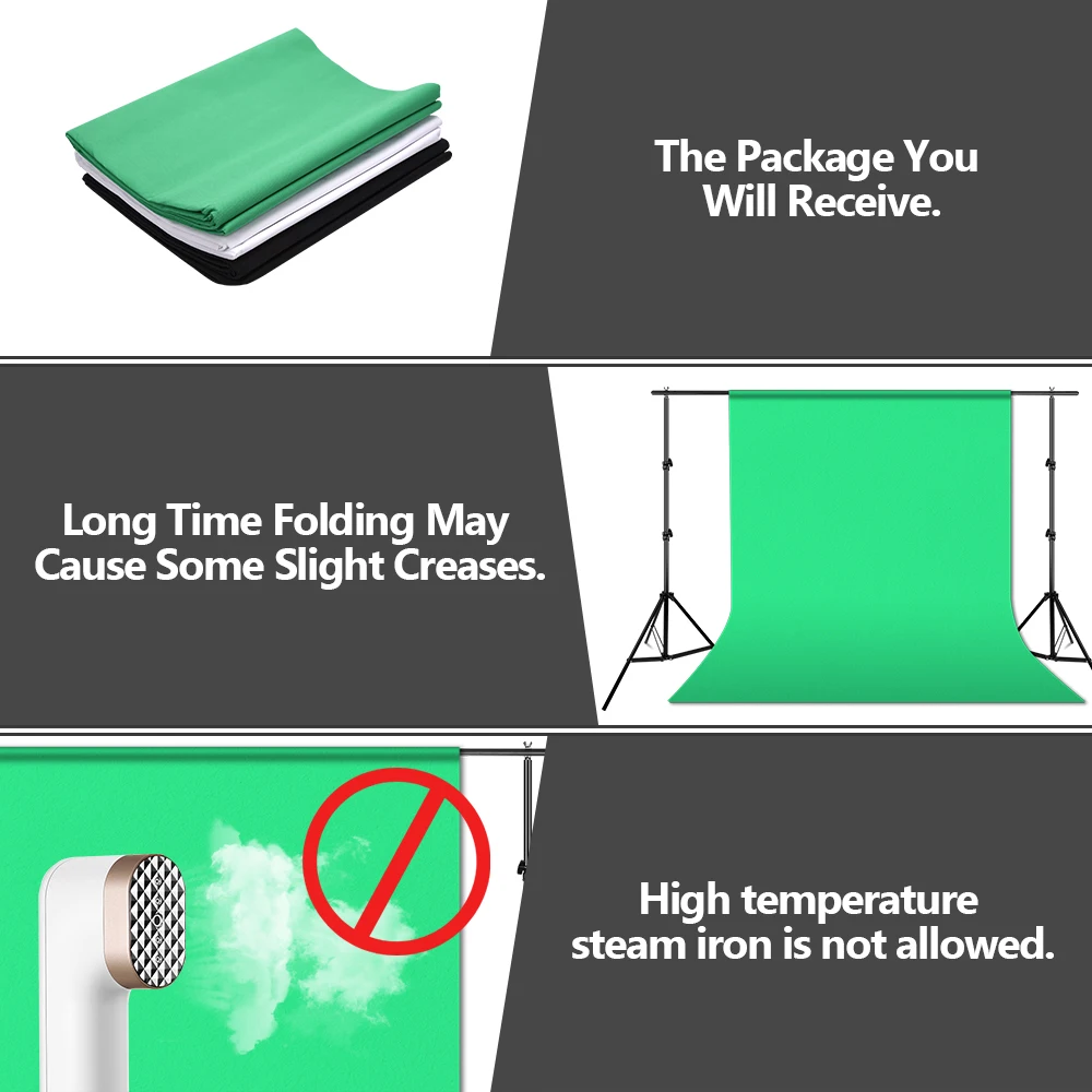 Этот набор для фона поставляется с тремя вариантами поддержки фона. Фон достаточно большой для большинства фотографий, таких как съемка полной портретной съемки небольшой группы людей или предоставление полного фона для различных поз модели в сидении, стоя или даже лежа. Фоны полезны в фотографии для обеспечения профессионального вида ваших фотографий. Этот комплект включает в себя один белый, один черный и один хромаки Зеленый Нетканый фон. Фон: Преимущество: стоимость меньше, прост в использовании, подходит для всех приложений, таких как фильмы спецэффектов и фотографии, Портативный и складной, чтобы впитать весь светильник без отражения. Размеры: 1,6*3 м (5FT * 10FT) Материал: Нетканая ткань Цвет: белый, черный и зеленый Примечание: Вы можете облегчить использование этих способов, когда дело доходит до некоторых складок: 1. Используйте влажное полотенце, чтобы вытереть складки, а затем используйте книгу, чтобы нажать на нее некоторое время; 2. Закатайте фон и отложите его в сторону. ** Высокотемпературный паровой утюг не допускается. Фоновая подставка: Функция: держать фоны и 2*2 м Фон Стенд Легкий, сверхмощный и расширяемый как для студии, так и для улицы и всех случаев, чрезвычайно подходит для всех фотографов уровня. Тип: комплект перекладин с подставкой Материал: алюминий Высота: до 2 м/6,6 футов Ширина: до 2 м/6,6 футов Размер посылка: 85,5*17*11 см/33,7*6,7*4,3 дюйма Посылка: 1x1,6*3 м черный фон 1x1,6*3 м белый фон 1x1,6*3 м зеленый фон 1x2 м * 2 м фоновая подставка 1 х сумка для переноски для фоновой поддержки 3 x зажимы