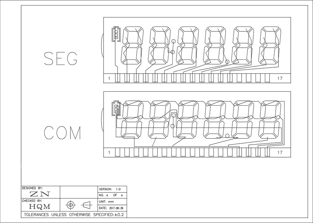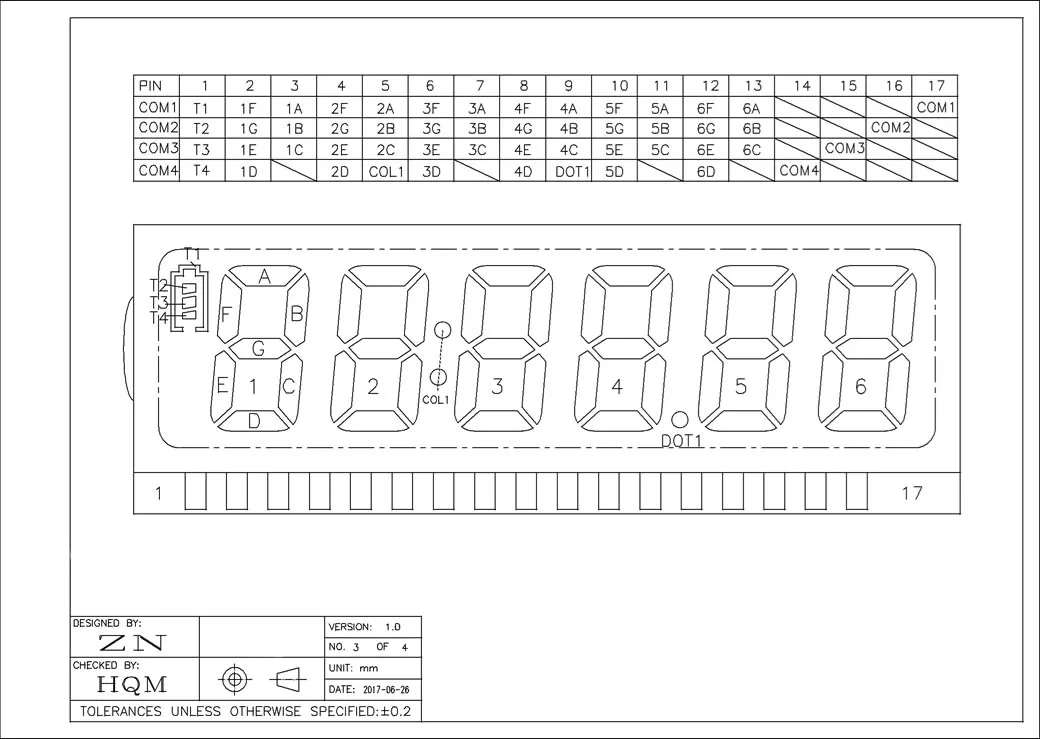 Сегмент ЖК-дисплей Панель Содержимое дисплея: 6 цифр Размер контура: 40,0*14,0*2,8 мм Активная площадь: 37,6*9,6 мм Режим отображения: TN, положительный Угол обзора: 6 часов Тип подключения: металлический штырь Режим привода: 1/4 рабочий режим, 1/3 смещения Подсветка: нет Рабочее напряжение: 3,0 V PIN нет. : 17P Рабочая температура: -30 ~ 80 градусов Температура хранения: -35 ~ 85 градусов