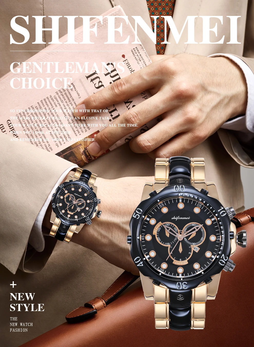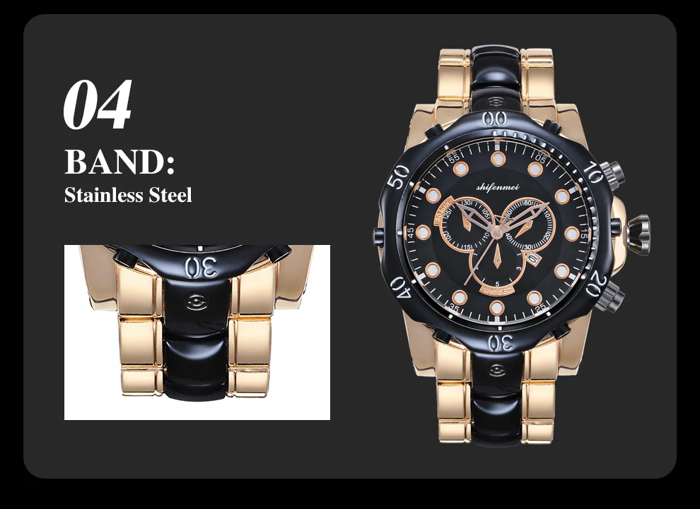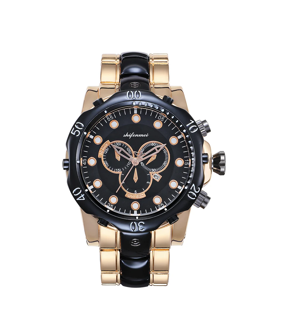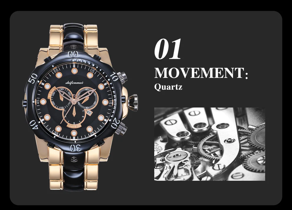 Описание продукта: Название бренда: Shifenmei Часовой механизм: кварцевый Зеркальная поверхность: Стекло Чехол: сплав Задняя часть корпуса: нержавеющая сталь Ремешка: сплав Пряжка: нержавеющая сталь Вес: 252 г Чехол Размеры: 53 мм Чехол Толщина: 18 мм Размер ремешка: 220*26 мм W/P: 3 ATM