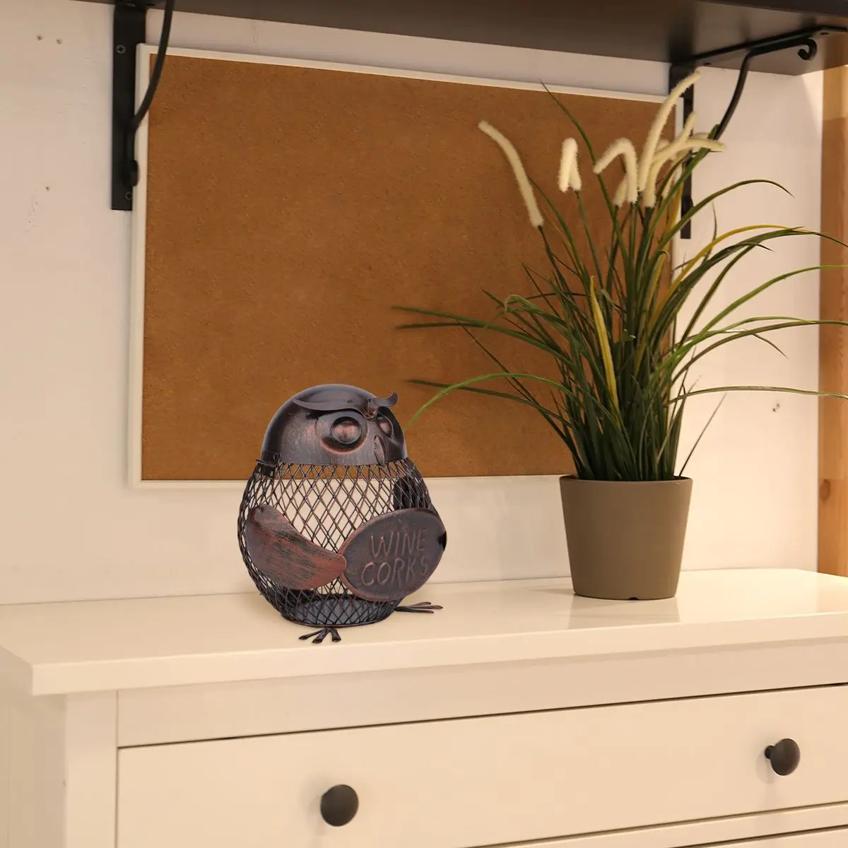 Это металлическая скульптура ручной работы в форме совы. Экологичная краска сохраняет ее нержавеющей, форма сетки отвечает требованиям современного дизайна. Его можно использовать для хранения винной пробки бутылки или других крошечных вещей. Практичный и художественный, выглядит очаровательно наивно.
