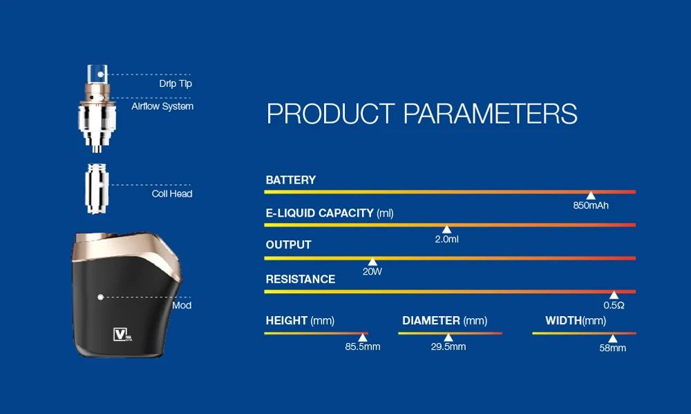 Включен детский замок, препятствующий случайному отключению атомайзера из Мода USB зарядка с ПК или настенным адаптером Простой заправки Легко менять головки катушки Многократная защита: защита от автомобильных замков 10 м, защита от короткого замыкания, защита от низкого напряжения, защита от перезарядки