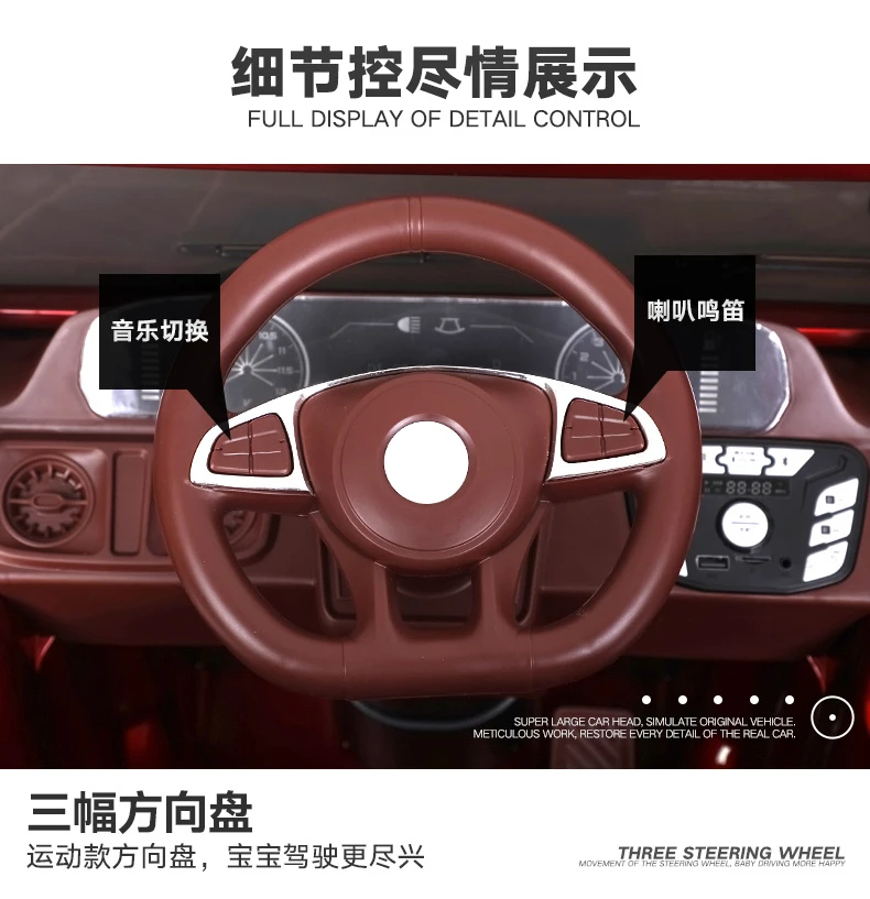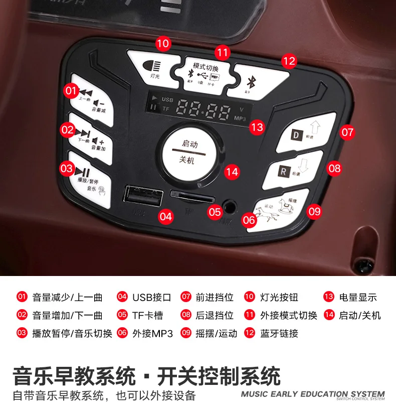 12V 7A батарея 4-х колесных дисков Бесступенчатая скорость Скорость 5 файлов Скорость вождения: 5-8 км/ч Динамическая приборная панель Регулировка громкости/дисплей батареи Многофункциональный музыкальный плеер USB разъем/TF карта разъем/MP3 Разъем Функция вперед/назад/качания Пульт дистанционного управления Bluetooth Независимое поглощение ударов Портативная ручка Кожаное сиденье Классный светильник Медленный старт Внешний вид лака Можно подключить мобильный телефон Bluetooth и воспроизводить мобильную музыку Размер изделия: 130*73*63 см
