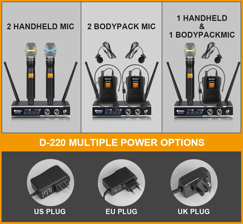 Дебра аудио D-220 UHF 2 канала Беспроводной микрофон Системы ручной микрофоны/петличный и гарнитуры микрофоны, подходит для всех типов производительность караоке speecn в церкви дома класса