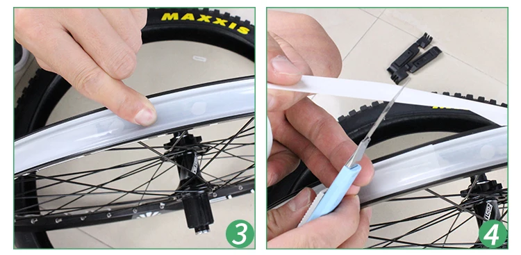 3. Потяните сильнее во время процесса обмотки, чтобы колодки для шин приклеились к внутренней стороне обода плавно без пузырьков воздуха 4. Обрежьте прокладку шины, намотав ее дважды вокруг обода.