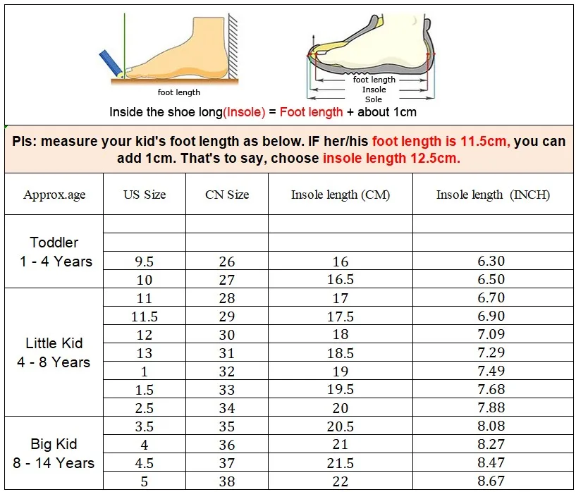 5.Что касается размера, Измерьте длину стопы ребенка в см или дюймах + 1 см или 0,03937 дюймаChВыберите соответствующий американский размер, спасибо