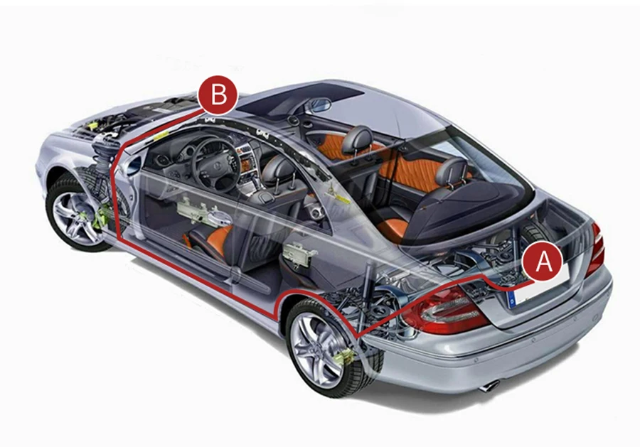 A-это задняя камера, блок питания подключен к положительным и отрицательным полюсам лампы заднего хода, красный-это положительный полюс, черный-отрицательный полюс, B-дисплей, красный-подключен к положительным полюсам ACC, И Черный подключен к отрицательному полюсу АКК.