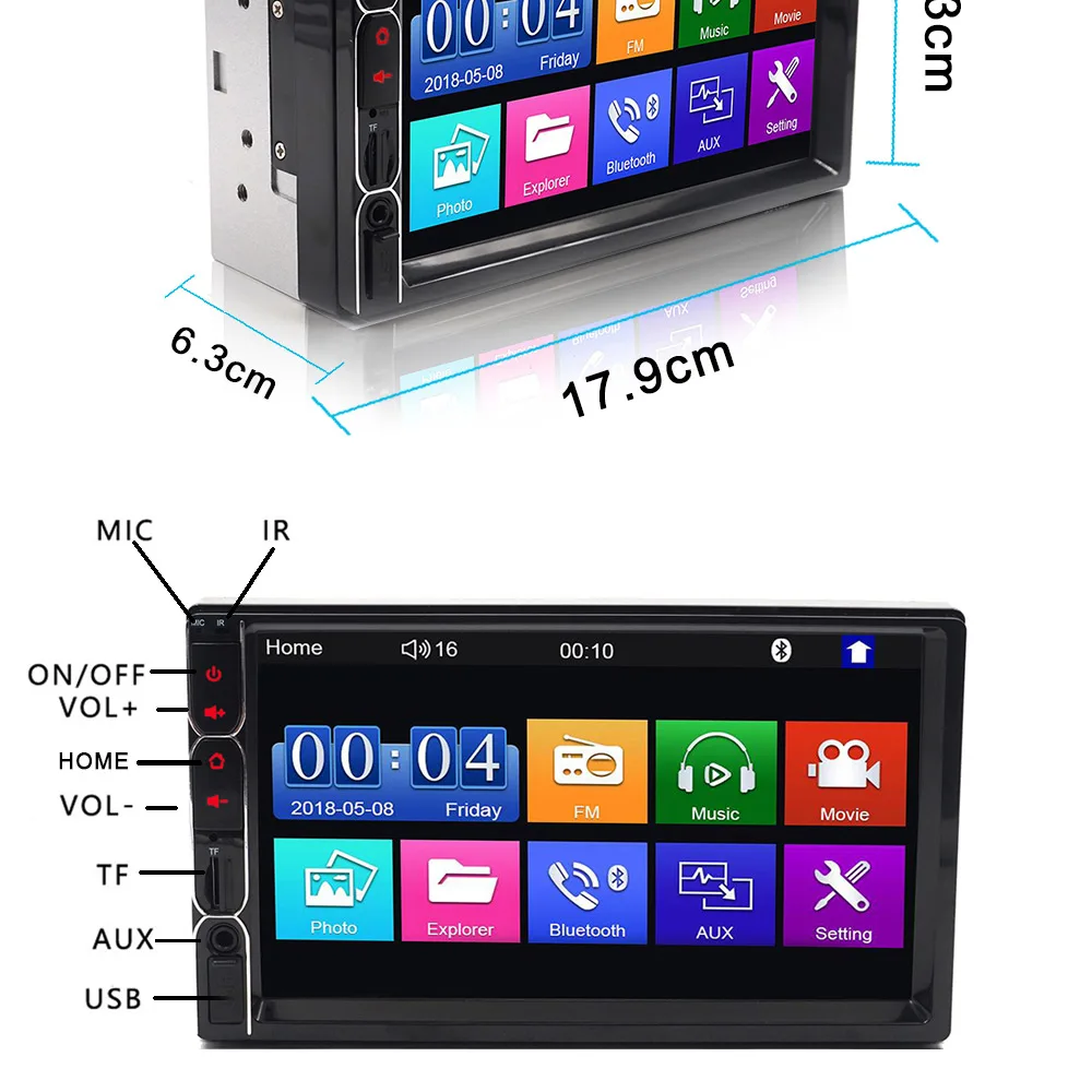 1,7 дюйма IPS full-view высокого качества сенсорный экран. 2. Поддержка беспроводного bluetooth-соединения и функции ручного бесплатного телефонного звонка. 3. Поддержка FM и встроенный вход Aux. 4. Поддержка sd-карты (до 32 Гб) и стандартного интерфейса USB 2,0. 5. Поддержка камеры заднего вида. 6. 24 часа цифровой дисплей часы и дата. 7. Может заряжать мобильный телефон или другие usb-устройства. 8. Красочные подсветки кнопки питания для украшения в вашем автомобиле. 9. Формат видео 1080P 10. Полный экран IPS.