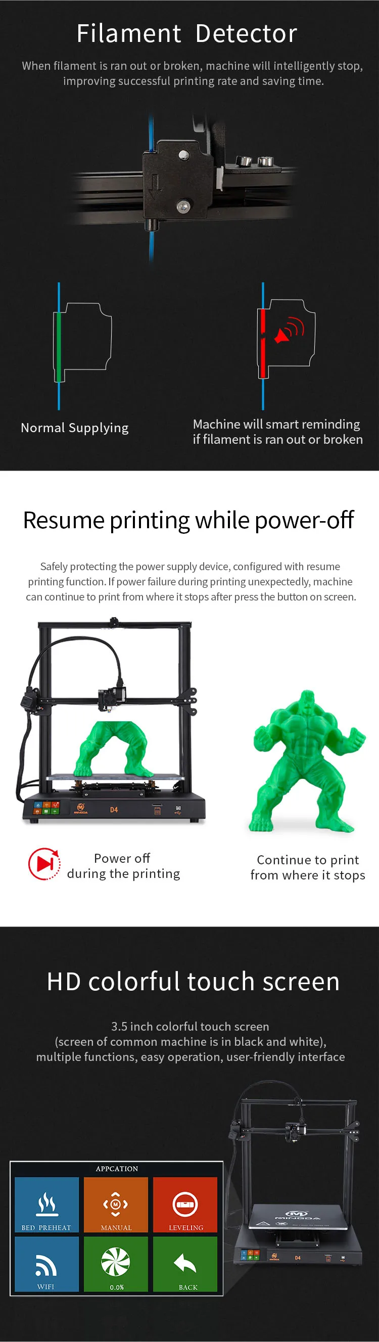1) с функцией Wi-Fi, вы можете подключить телефон, чтобы контролировать рабочий статус 3D принтера в любое время. 2) камера работает с Wi-Fi, обеспечивает функцию дистанционного управления и мониторинга для 3D принтеров. 3) 3,5 дюймовый цветной сенсорный экран (экран общей машины в черном и белом цвете), несколько функций, простота в эксплуатации, удобный интерфейс 4) упрощенные шаги установки, только четыре винта и стойки, и стандартный провод, даже для нового начинающего может быстро установить 3D-принтер. 5) 420X420X400 мм размер печати, увеличивает ваше чувство достижения. 6) Наша печатающая головка поддерживает практически любые имеющиеся нити, включая: PLA, ABS, PLA композитные материалы (углеродное волокно, дерево, медь, латунь, магнитная), бедра, нейлон, TPE & TPU (FleX), PETG... 7) Различные функции выравнивания: автоматический регулятор уровня и вспомогательное выравнивание, повышение точности печати 8) Тепловая кровать может достигать 110 градусов быстро, чтобы сделать ее законченной печатью быстро и в состоянии напечатать небольшие модели с ABS материалом 9) UPS (Система бесперебойного питания), при выключении питания, наша машина перестанет работать и хранит память в течение 24 часов. Что очень важно для модели большого размера .. 10) датчик накаливания, 3d принтер машина перестанет работать, если нет нити 3D принтера, и будет работать, если повторно вставить новые материалы. 11) Автоматическое отключение питания, машина может быть автоматически отключена после завершения печати модели. Так что, если вы хотите выйти или сделать что-то, что займет больше времени, вы не беспокоитесь о отключении питания.