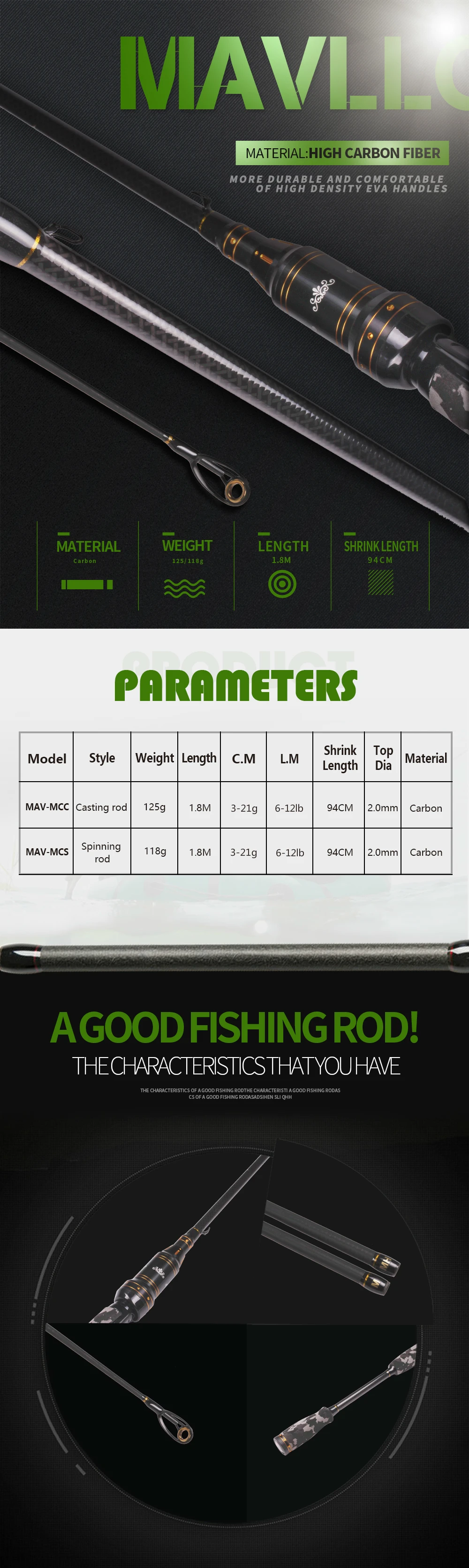 Вес: 118 г (1,8 м спиннинг) / 125 г (1,8 м литье) / 130 г (2,1 м спиннинг) / 147 г (2,1 м литье)