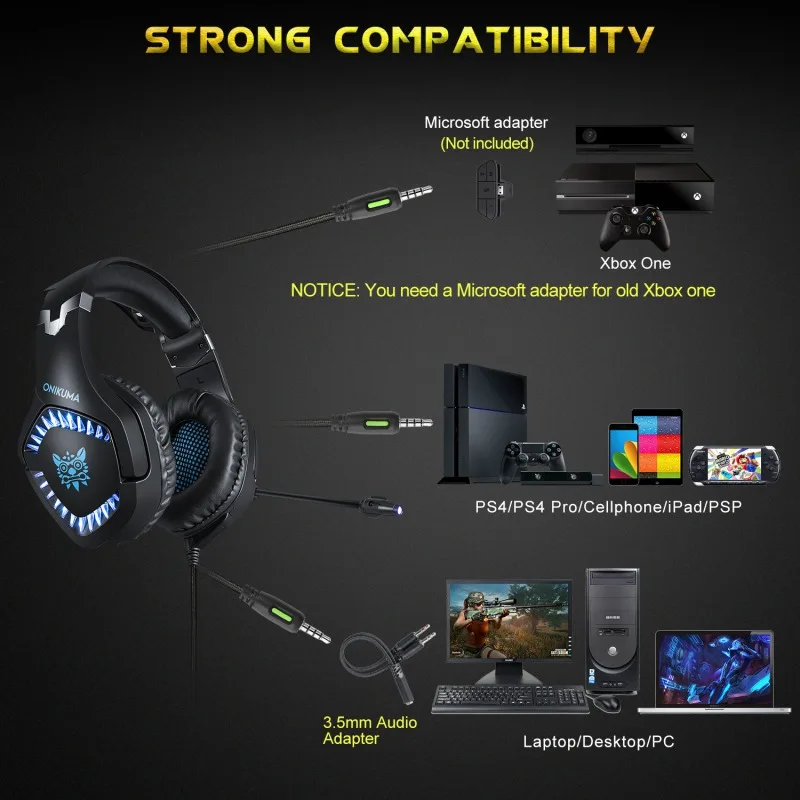 Примечание: Эта гарнитура не является usb-гарнитурой, usb-интерфейс используется только для источника питания, чтобы светодиодный светильник. Посылка: 1 * игровая гарнитура ONIKUMA K1pro 1 * отклонения в размерах на 1-2 3,5 мм адатпера Настройка PS4: 1. Прежде чем применять гарнитуру на PS4, пожалуйста, проверьте ее с помощью своего мобильного телефона, чтобы убедиться в этом Хорошо функционирует. 2. Вставьте гарнитура собственный 3,5 мм штекер в геймпад, затем нажмите и удерживайте кнопку PS или Введите настройки системы. 3. Есть периферийные машины, выберите «настроить звук и устройства», «выход на Наушники, затем измените их на «все аудио».