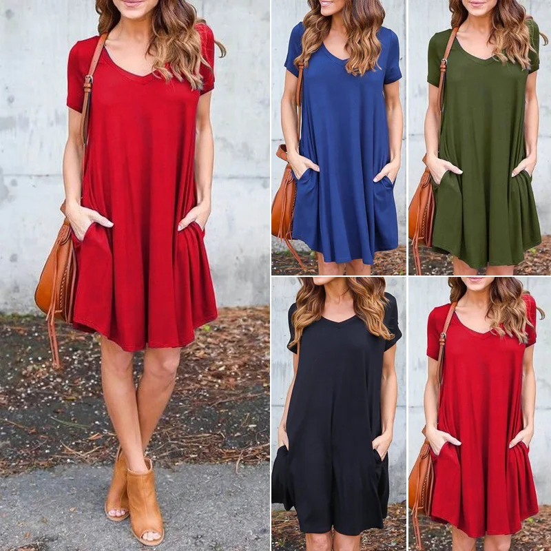 * Описание товара: новое летнее женское повседневное Свободное платье с v-образным вырезом и короткими рукавами с карманами