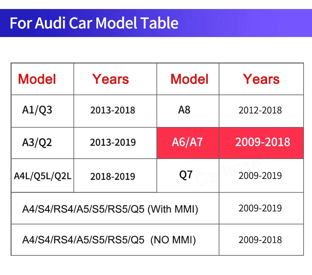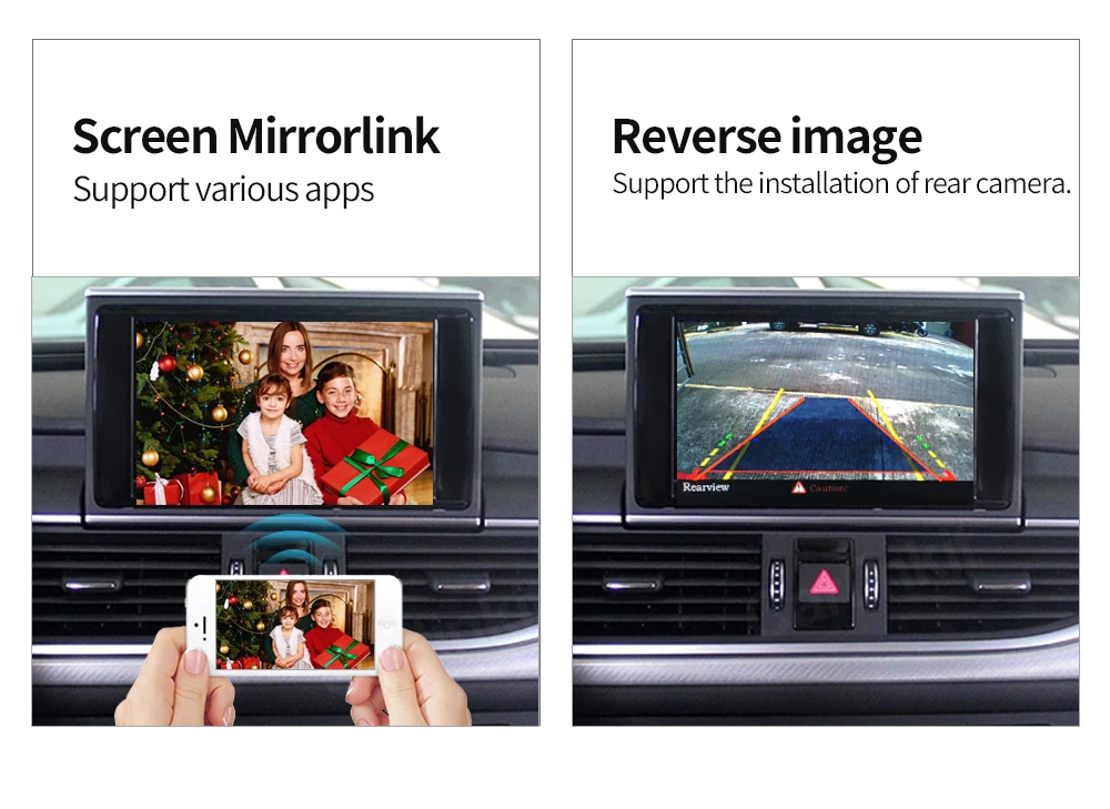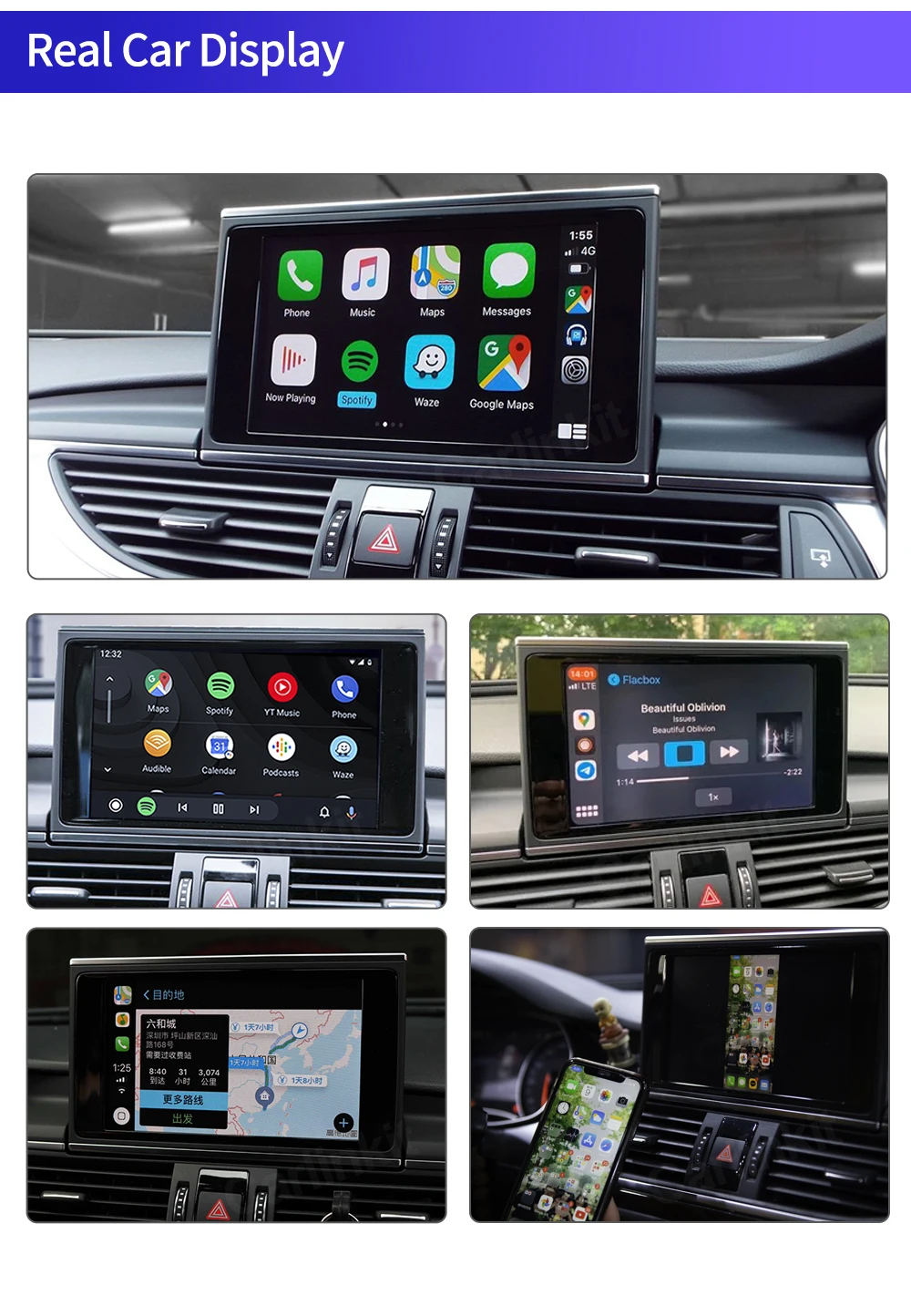 1. Работает с Apple CarPlay, сопряжение через Bluetooth, передача через WIFI. 2. Работает с проводным CarPlay также, сначала выключите Wi-Fi, подключите через кабель освещения (проводное Удерживайте телефон одновременно) 3.Android Mirroring-Link для телефонов Android (ссылка для скачивания) 4.GPS навигационные приложения, Google Maps, Waze и Apple Maps доступны в режиме реального времени 5. Музыка яблоки Spotify,Apple Music, Amazon и т. Д. Аудио через фабрику Audi media, текст на дисплее для некоторых приложений. 6. Голосовое управление, говоря: "Эй, Сири... 7.Aftermarket фронтальный/задний/360 вход камеры. (Поддерживаются динамические Направляющие линии) 8.USB флэш-накопитель для воспроизведения музыки и видео с помощью подключения USB порта от CarPlay kit 9. Регулировка эквалайзера. Лучшее качество звука. Выберите свой любимый стиль свободно (поп, рок, мягкий, стандартный ..) 10. Полное управление кнопками OEM.
