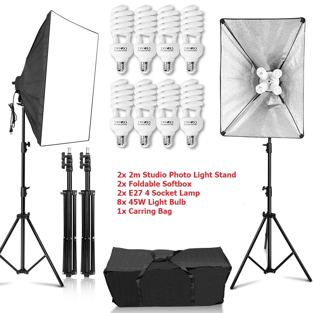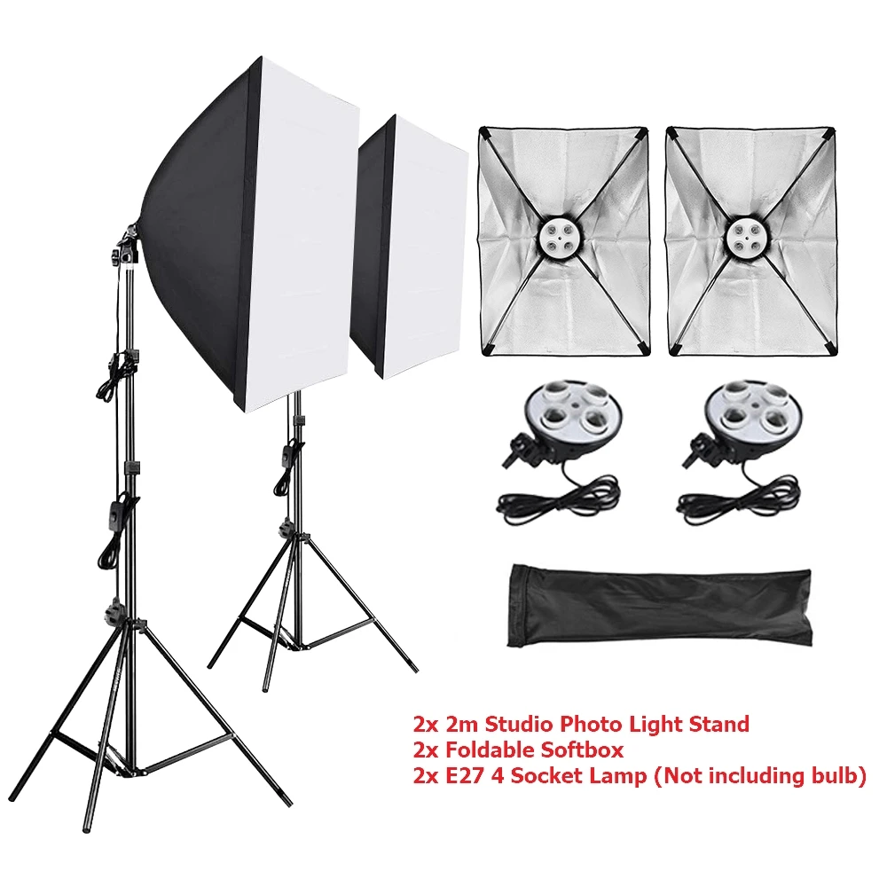 Посылка включает в себя: 2x2 м студийный светильник для фотосъемки 2x складной софтбокс 2x E27 4 гнезда лампы (не включая лампу)