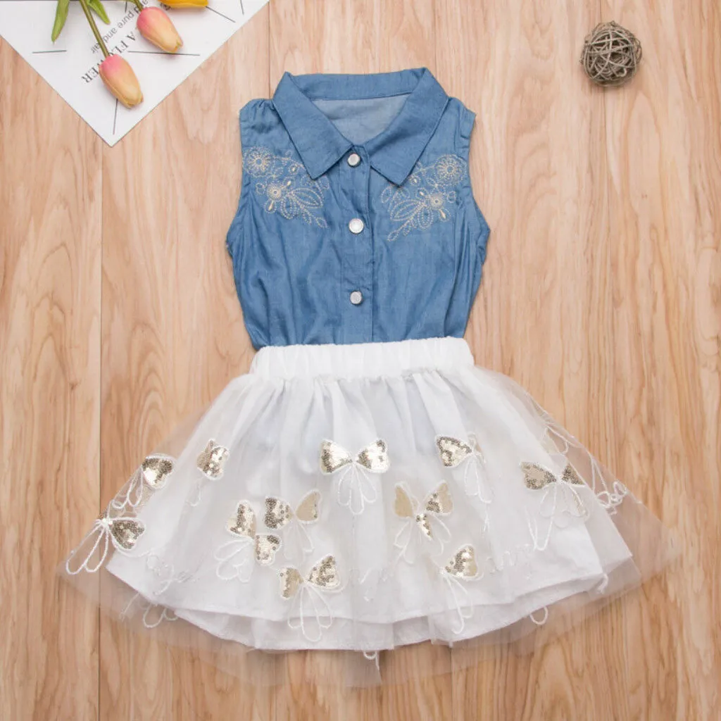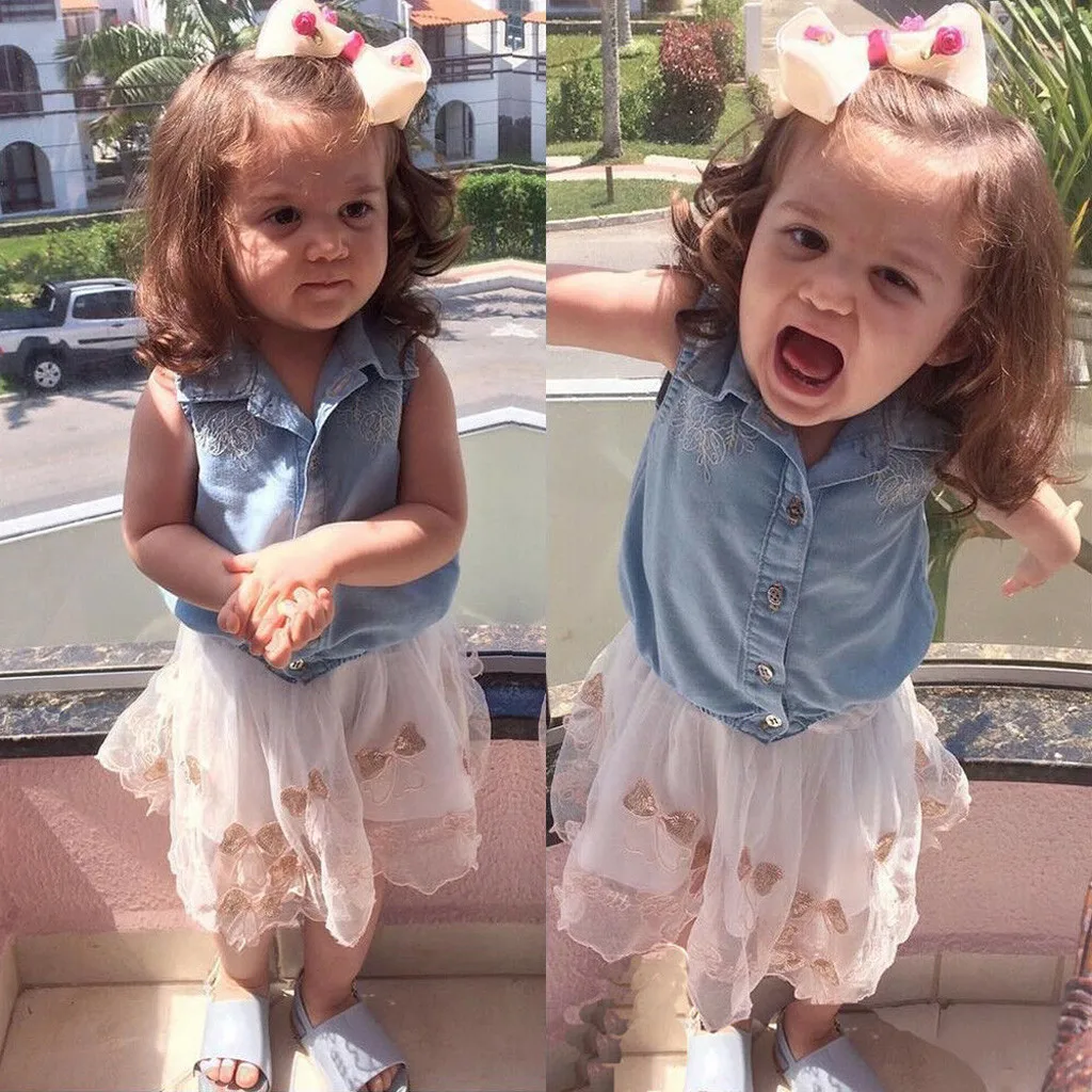 Детская джинсовая футболка для маленьких девочек, топы, одежда + платье с юбкой-годе, комплект юбки