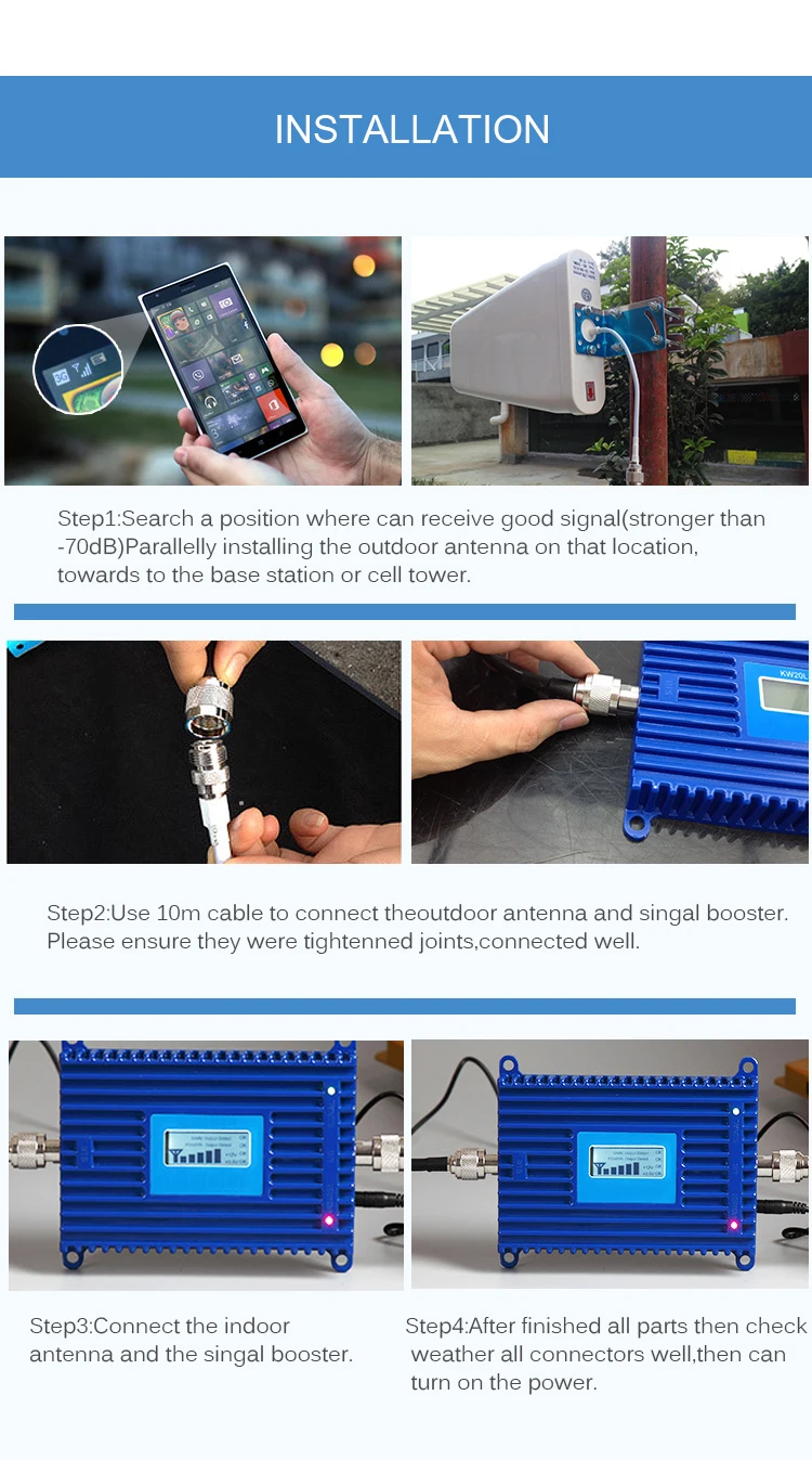 Вопрос: нет сигнала на дисплее и телефоне Решение: Отрегулируйте наружную антенну, поставьте ее на более высокое положение и убедитесь, что она может получить хороший сигнал от базовой станции. Или, пожалуйста, проверьте freqeuncy вашей антенны, если вы покупаете только усилитель от нас. Если частота не совпадает с усилителем, она также не может работать. Вопрос: дисплей мигает и сигнальный светильник не включен. Решение: Также настройте Наружные Антенны, как указано выше, потому что мигание означает, что сигнал приема не является стабильным. Отрегулируйте положение и направление наружной антенны до тех пор, пока она не перестанет работать. Queation: сигнал на максимум на усилителе, но сигнал на телефоне совсем не улучшается Решение: это то, что мы называем «феноменом самоколебаний». Вам нужно увеличить расстояние внутренней антенны и наружной антенны и отделить их кирпичной стеной. Убедитесь, что между ними нет зоны открытия. Вопрос: Усилитель работает должным образом, но сигнальный светильник не включен Решение: может быть, кабель слишком длинный для бустера или соединение не очень хорошо. Пожалуйста, убедитесь, что все антенны подключены хорошо и плотно. На самом деле это не имеет большого значения, если устройство работает хорошо. Любые другие проблемы по поводу продукта или установки, пожалуйста, свяжитесь с нами. Спасибо!