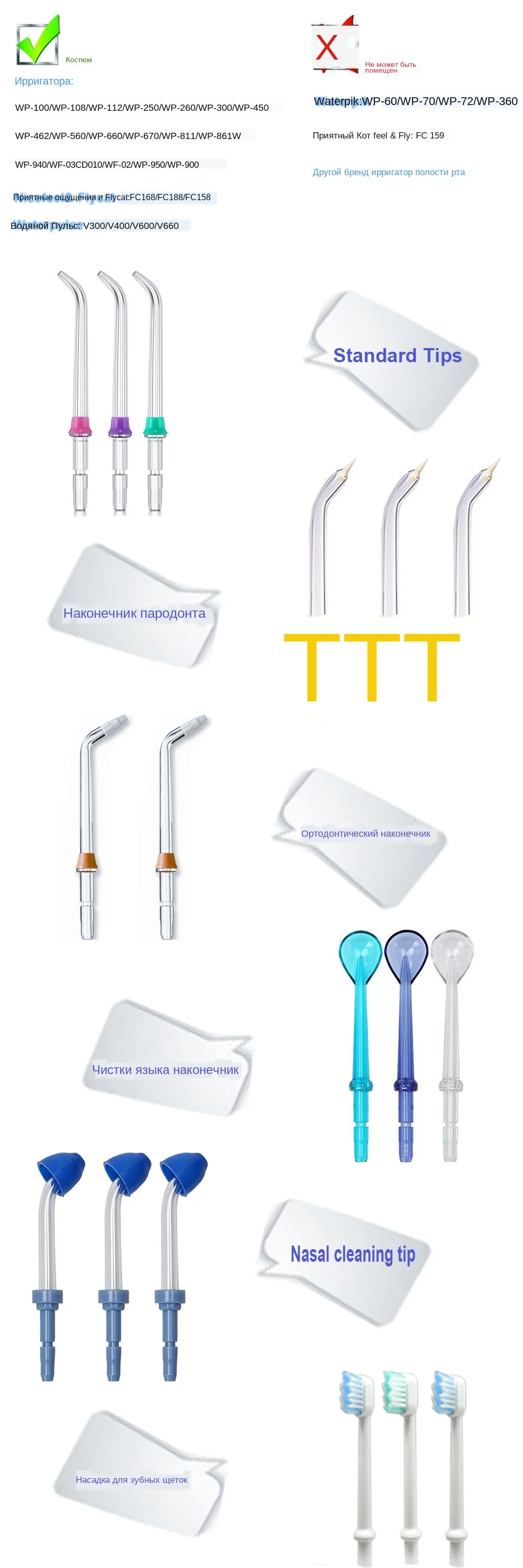 Длится долгое время: Эти зубные насадки для струй воды (насадки) изготовлены из хорошего качества, долговечны и не легко ломаются, служат в течение длительного времени и заменяют Оригинал каждые 3 месяца. Функции: Эффективно очистите зубы и некоторые зоны теней, такие как разрез и гумлин, регулярная ежедневная Чистка зубов обеспечивает состояние здоровья ваших зубов. Совместимость с: WP-100/WP-108/WP-112/WP-250/WP-260/WP-300/WP-450 WP-462/WP-560/WP-660/WP-670/WP-811/WP-861W WP-940/WF-03CD010/WF-02/WP-950/WP-900 Nicefeel & Flycat : FC168/FC188/FC158 Водяной Пульс: V300/V400/V600/V660 Дружеские советы: Не делитесь водными струйными наконечниками с другими. Пожалуйста, заменяйте советы каждые 3 месяцаКаждый наконечник струи имеет различные функции, ниже приведены три вида, которые часто используются. Кроме того, в соответствии с потребностями, вы можете составить самостоятельно.