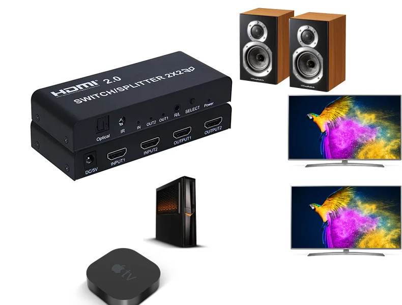 Этот коммутатор 2x2 HDMI 2,0/сплиттер может Подключать два источника сигнала HD с двумя клеммами hd-дисплея, он позволяет разделять два HDMI сигнала или переключаться на два совместимых с HDMI монитора или проекторы. И он может усиливать ваши сигналы HDMI одновременно. Эти два источника сигнала могут быть свободно переключены через кнопку или пульт дистанционного управления. HDMI2.0 Switcher/Splitter 2x2 может поддерживать формат видео full HD, высокое разрешение 3840x216 0/60 Гц.